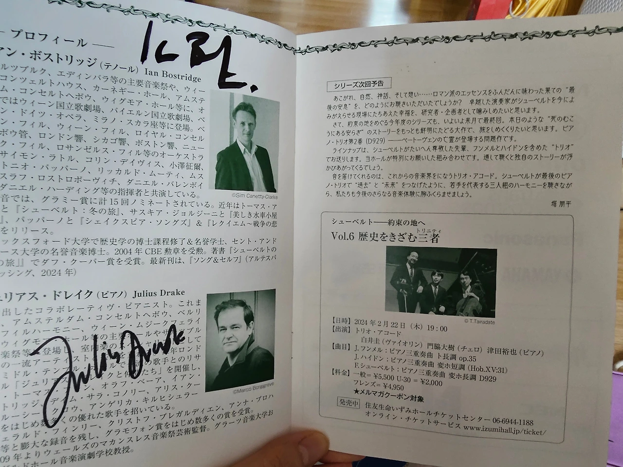 이안 보스트리지를 아주 좋아하지는 않았다. 선이 너무 얇다고 해야 할까. 노래를 분명히 잘하고 해석도 좋은데 너무 아름다워서 가끔 부담스러웠다. 바바라 보니 같은 느낌? 그래서 살짝 망설인 것 하나와 이미 60에 다다른 그의 나이를 생각하니 체력이 달리지는 않을까 하는 걱정에 조금 고민했다. 그래도 보스트리지잖아!!! 재빠르게 최근 그의 연주에 대한 후기를 검색하고는 가기로 결정했다. 일본어를 잘하는 친구에게 부탁해서 남은 좌석이 충분한지 현장 구매가 가능한지 확인해 달라고 부탁했다. 그리고 가기로 결정했다. 티켓 가격도 8000엔이면 진짜 너무 착하다. A석은 6000엔이었다. 그가 우리나라에 최근 독창회를 하러 왔을 때 롯데 콘서트 홀의 좌석 가격이 최저가 십만 원이 넘었던 것으로 기억한다.