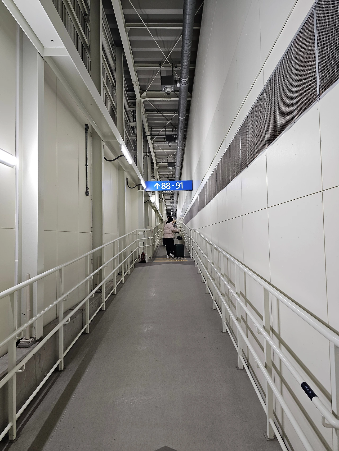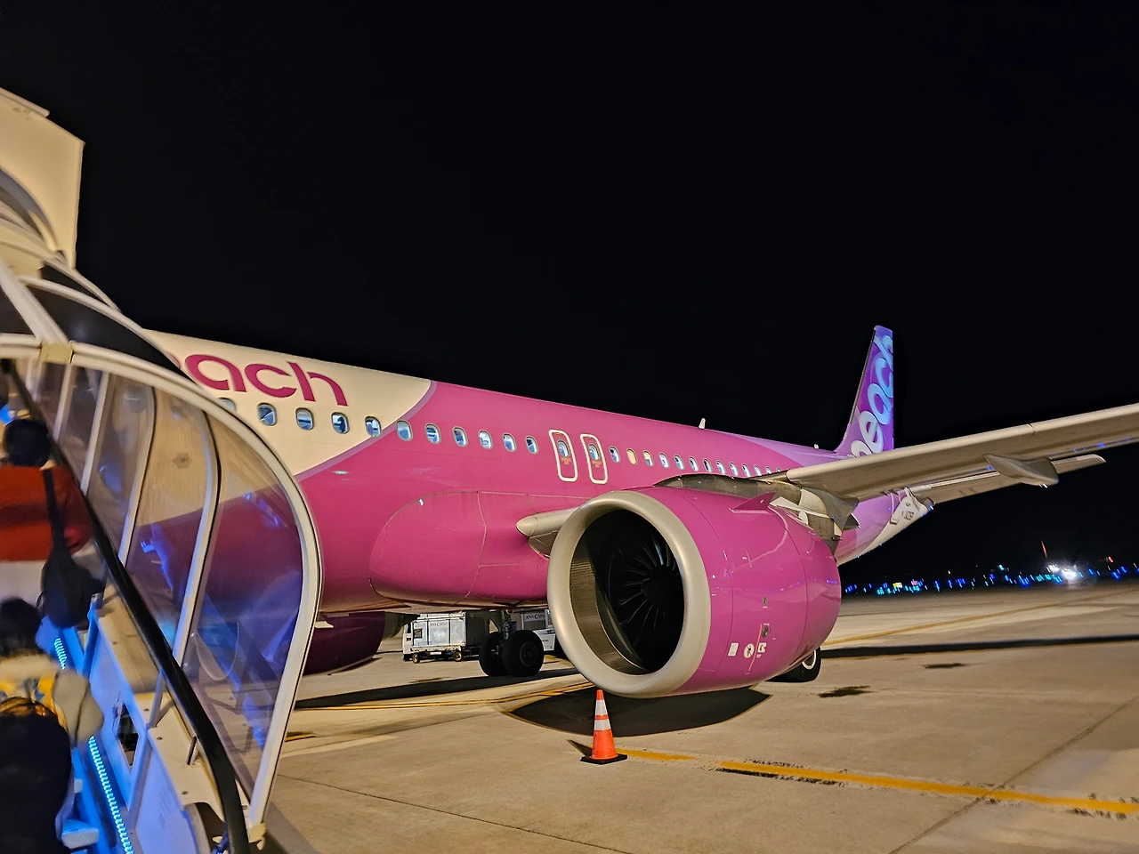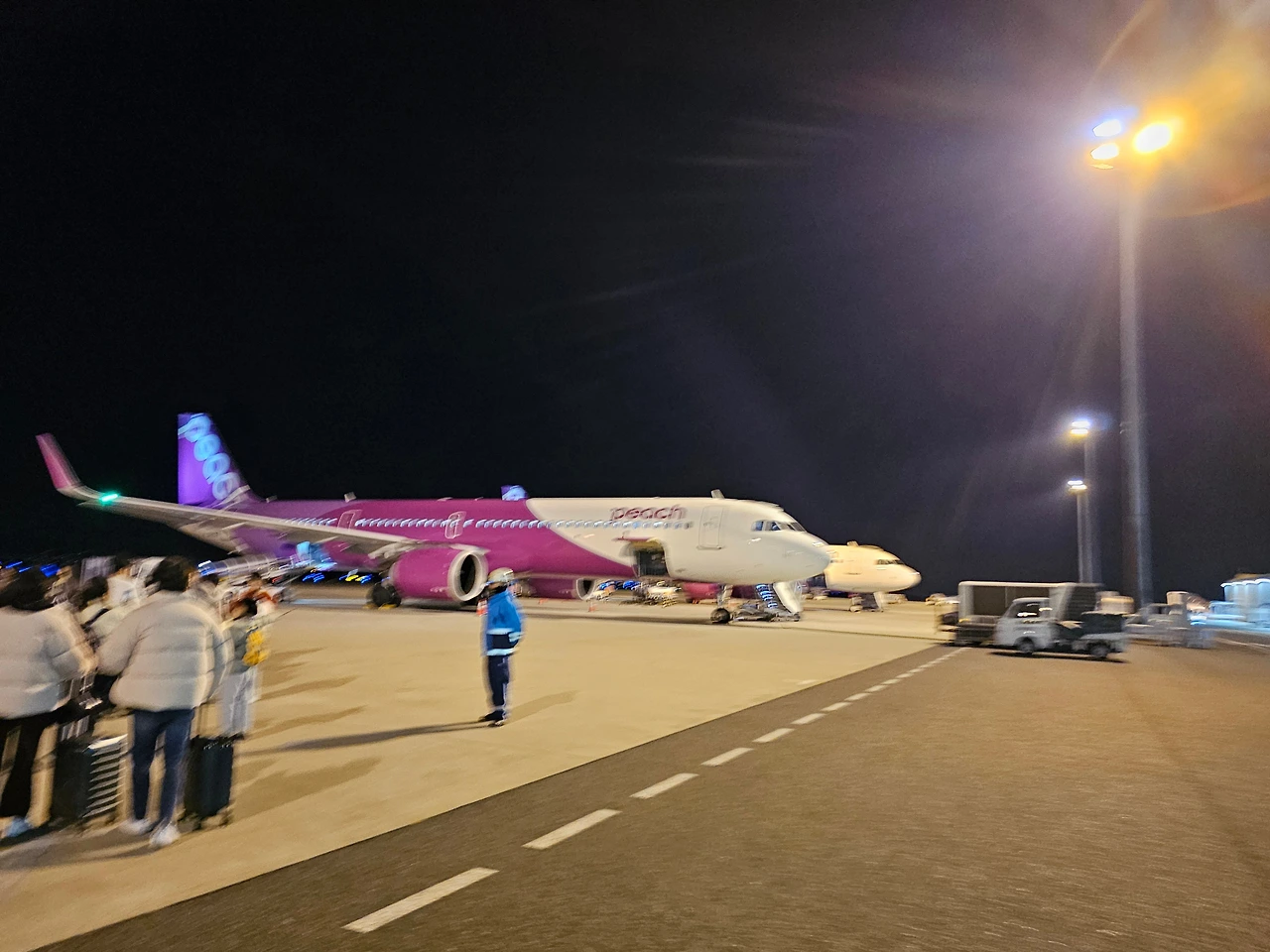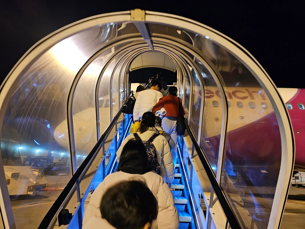 지난번 인천공항에서도 그랬는데 미리 줄을 서서 기다리시는 분들은 결국 포기하고 바닥에 주저앉기 시작했다. 한참을 기다린 끝에 드디어 탑승이 시작되었다. 시작된 줄 알았다. 들어가 보니 이렇게 공장처럼 생긴 탑승로를 한참 걸어가야 한다. 거기서도 줄을 서서 기다렸다. 무작정 서 있기 싫어서 기다렸던 것인데 두 번 기다릴 줄이야. 문이 열리고 나서도 비행기로 바로 이어지지 않고 밖으로 나와 계단을 타고 올라간다. 내가 탈 비행기는 다른 피치항공 비행기보다 더 작고 귀여웠다.