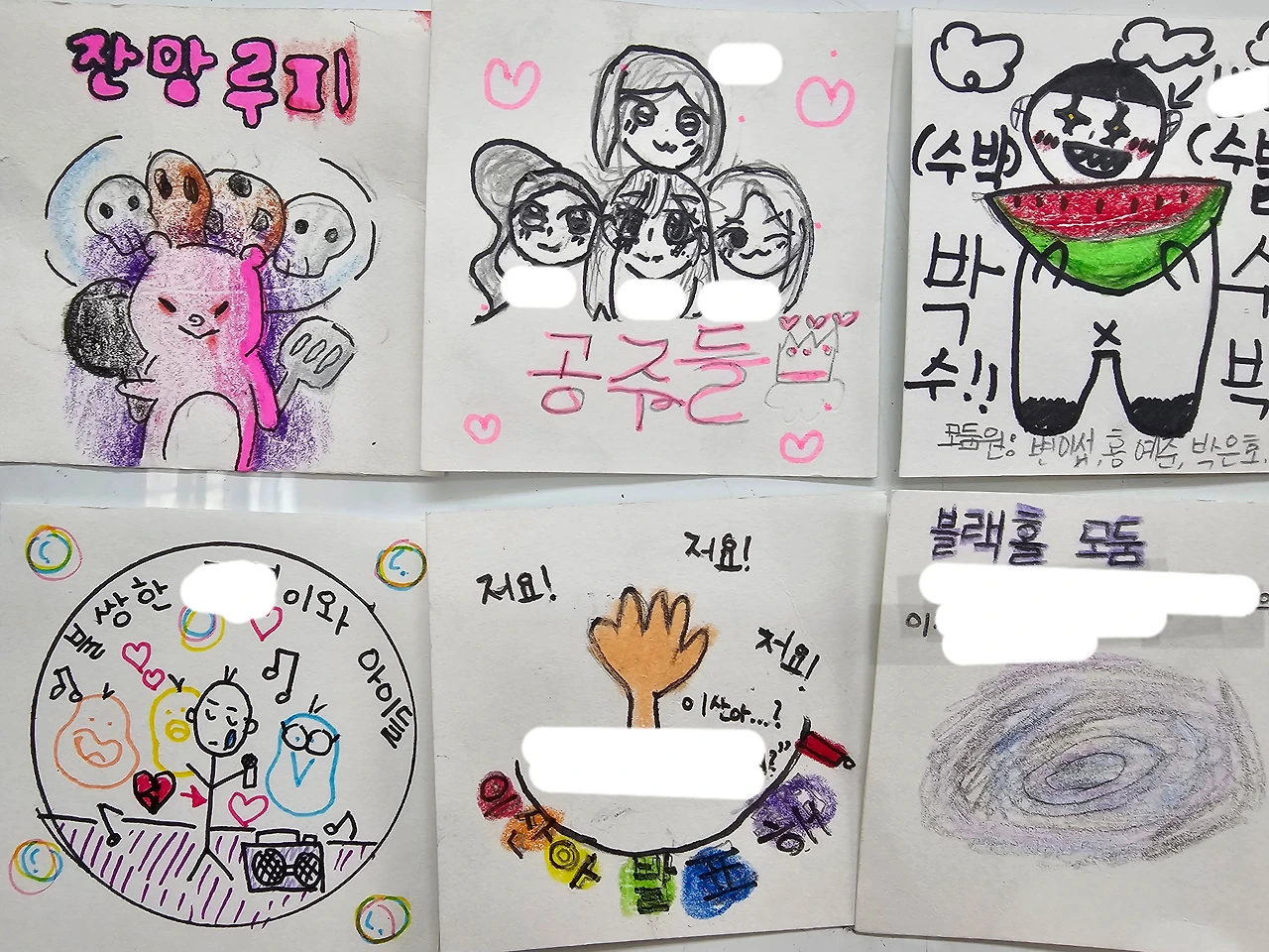 오늘은 짝도 바꿔야 하고 마니또도 맞춰봐야 하고 어린이날 기념 과자파티도 있으니 아이들 마음이 붕붕 떠 있다. 짝을 바꾸고 모둠 이름을 정한 다음 소개를 하는데 또 빵빵 터졌다. 이번에는 여자 아이들로만 구성된 모둠이 하나 있었다. 절대 안 그럴 것 같은 아이들이 모둠 이름을 '공주들'이라고 정하더니 손을 앞으로 주욱 내밀면서 "안녕하세요! 저희는. 공주들!입니다!. 왼쪽부터 큐티, 프리티, 무슨 티 무슨 티를 담당하고 있습니다!" 으아아..... 나 이런 거에 내성이 없단 말이다. 반 아이들도 단체로 쓰러졌다. "얘들아. 선생님 갑자기 춥다." 하면서 카디건을 껴입으니 또 까르르 웃는다. "저희 모둠은 'ㅇㅅ아 발표해!' 모둠입니다. ㅇㅅ이가 하도 발표를 안 하니까 ㅇㅅ이면 발표를 하면 됩니다." "ㅇㅅ아 그래서 발표 이번엔 많이 할 거야?" "아니요." 너무 당당한 ㅇㅅ이 목소리에 우리는 모두들 또 빵 터지고 말았다. "저희 모둠은 '불쌍한 ㅈㅇ이와 아이들' 모둠입니다." "ㅈㅇ이가 아이돌이라고?" 또 여기서 까르르. "아니이 아이들이라고. ㅈㅇ이만 남자고 다 여자 아이들이잖아." "흑흑흑 나 불쌍해."라고 ㅈㅇ이가 우는 시늉을 하지만 사실은 아주 만족스러워 보였다. "저희 모둠은 범죄도시입니다." "아 미안하지만 긍정적인 이름으로 바꿔서 다시 만들어 주세요." 그렇게 범죄도시 모둠은 수박박수 모둠이 되었고 마지막은 잔망루피 모둠인데 잔혹루피 그림을 그려와서 아이들은 또 신나게 웃었다. 시작부터 짝이 마음에 안 든다고 암울한 기운을 뿜어내는 한 모둠은 블랙홀이라고 이름을 지었는데 또 의외로 아주 잘하고 있다.
