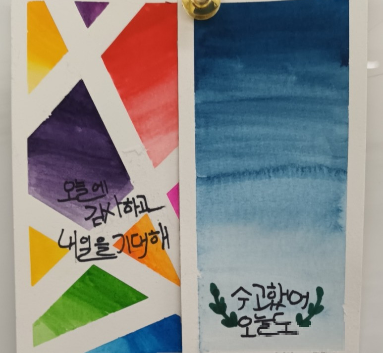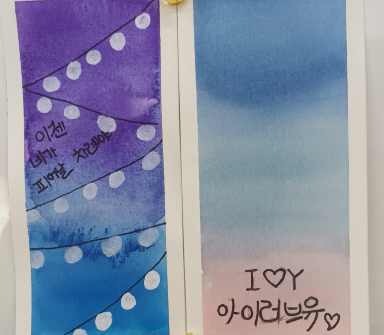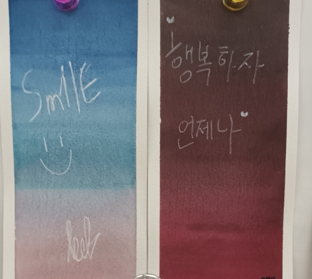 아이들과 책갈피를 만들었다. 한 가지 색을 이용한 그라데이션이 아닌 두 가지 이상의 색을 섞어서 만들어 보자고 하고 며칠간 찾아본 샘플 작품들을 보여주고 다양한 기법을 보여주었다.
