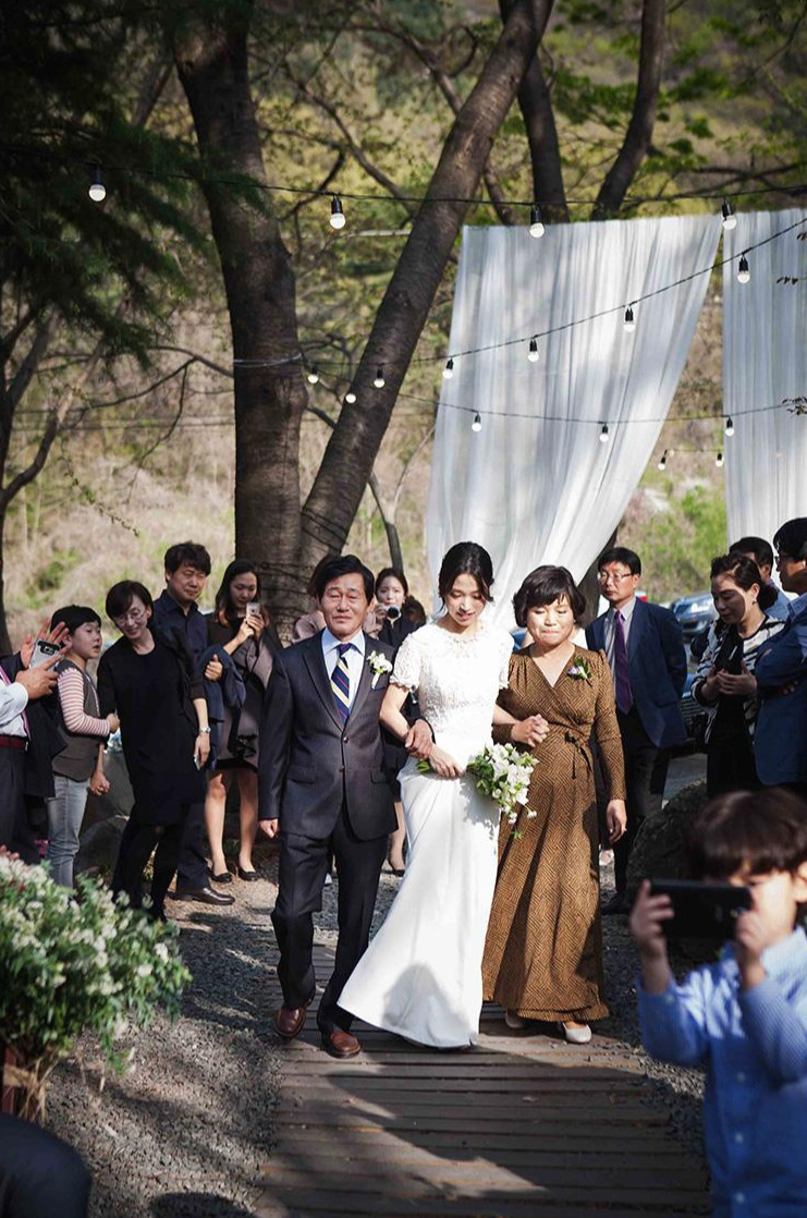 보통의 결혼식이랑은 남달랐던 것 같은데 보통 결혼식이 어떤 게 있죠?(웃음) 사실 신부신랑 입장은 조금 더 고민하고 의미를 담았어요. 오빠네는 부모님께서 먼저 입장하시고, 오빠 혼자 들어갔어요. 두 분의 결혼식을 생각하시면서 먼저 입장하셨으면 좋겠다는 의미로 했는데 실제로 그때 생각이 나셨다고 하시더라고요. 신부 입장할 때는 아빠랑만 들어가는 게 조금 이상한 것 같아서 저는 엄마 아빠! 양쪽에 팔짱 끼고 같이 걸어 들어갔어요.