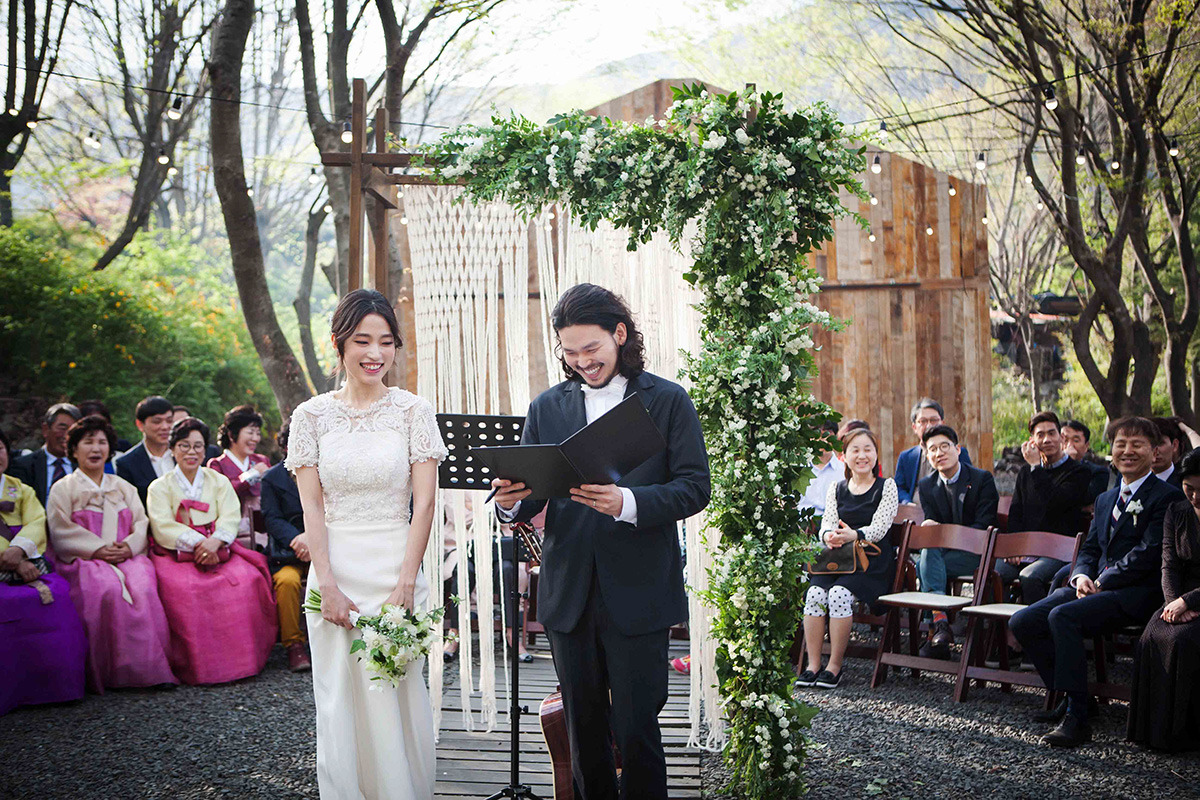nuri&bony 원래부터 저희는 홀 예식이 싫었어요. 어릴 때부터 ‘왜 저렇게 결혼하지?’ 친구들이랑도 결혼식에 대한 얘기를 하다 보면 두 사람에 집중하기보다는 돈을 주고받는 장소라는 생각이 들었어요. 사실 그게 맞기도 하잖아요. 하지만 저희는 어차피 둘이 하는 결혼. 우리 하고 싶은 대로 하고 싶었어요. 부모님도 워낙 개방적이셔서 그렇게 하라고 흔쾌히 허락해주셨고요. 처음에는 하객도 작게 하려 했는데, 부모님 지인도 오셔야 해서 각각 50명씩 총 100분의 하객과 함께 하게 되었어요.