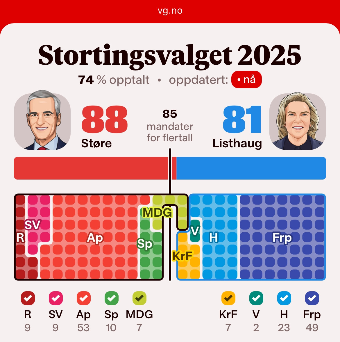 노르웨이의 정치 지형을 파악하려면 정당의 숫자와 색깔에 대한 이해가 우선적으로 수반되어야 한다. 노르웨이에는 현재 22개의 정당이 있는데, 그중 선거에서 1% 이상의 지지율을 꾸준히 기록하는 정당만도 9개에 달한다. 이번 선거는 아르바이데르파르티에(Arbeiderpartiet, Ap), 우리말로 하면 “노동당” 정도로 번역되는 정당이 지난 선거에 이어 두 번 연속 승리하여, 현 총리인 요나스 스퇴레(Jonas Støre)의 정권이 4년 연장되는 결과를 남겼다.