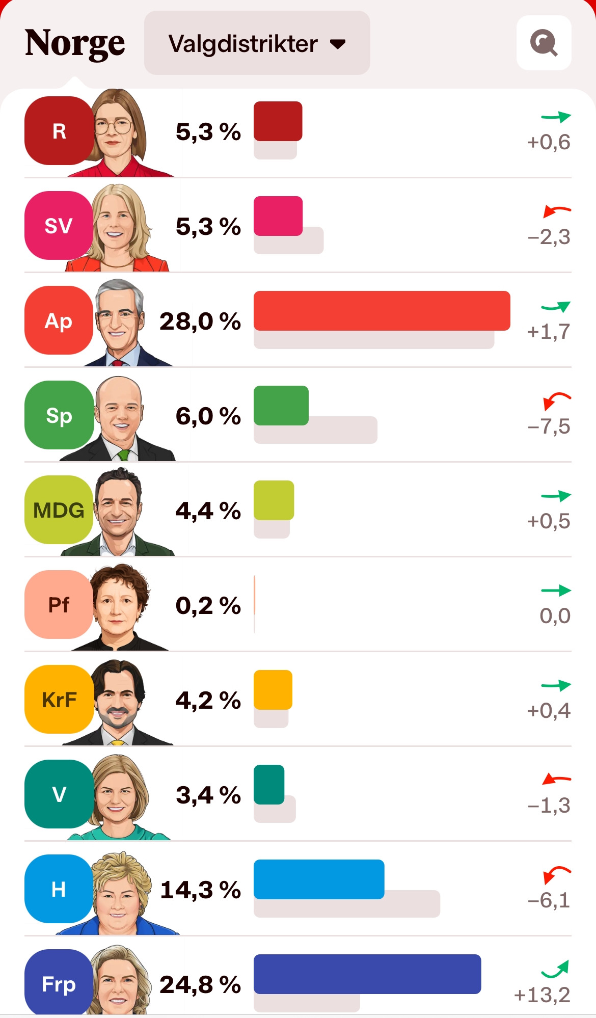 선거에 승리했다지만 노동당이 거두어들인 표수는 전체 투표수의 28%에 지나지 않는다. 이는 지난 선거에 비해 1.8% 정도 높은 수치로, 표심을 그런대로 유지했다는 해석도 크게 무리가 없어 보인다. 오히려 지난 선거에서 11.6%의 득표에 그쳤던 프렘스크리츠파르티에(Fremskrittspartiet, Frp)가 13.2%를 더 받은 득표율 24.8%를 기록하여 2위 정당으로 발돋움한 점이 더욱 부각된다. 반면 우파 정당의 기둥이자 노동당 집권 이전 총리를 배출했던 회이레(Høyre, H) 당은 지난 선거 대비 6.1%가 떨어진 14.3%의 득표율로, 거의 추락에 가까운 지지율 하락을 기록했다.