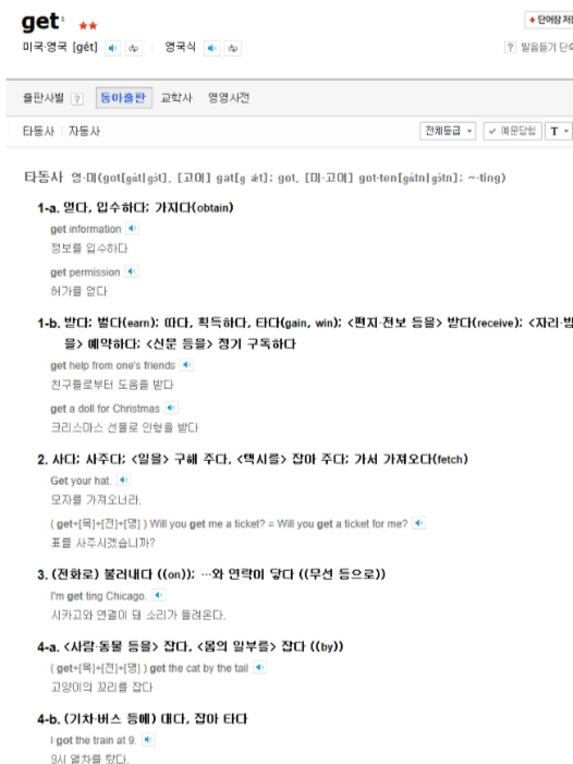 처음에 말했던 것 처럼 영어는 동사가 덜발달해서 쉬운 동사로 말하는 좋아합니다. 한국어는 동사표현이 다양해서서 "부축하다","챙기다"고 말하는 것을 영어에서는 쉬운 동사 get으로 다 말하고 있네요. 사전에서 get을 검색하면 정말 많은 뜻이 나온다는 것을 아실꺼에요. 거꾸로 뒤집어 보면 어마어마하게 다양한 한국어 동사들은 영어로는 쉬운 동사인 get 하나로 다 말할 수 있다는 뜻이죠. 그렇다면 이 모든 뜻들을 일일이 외울 수도 없고 쉽게 말하려면 어떻게 해야 할까요? 바로 각 동사들의 근본적인 뉘앙스를 아는 겁니다. 쉬운 동사들은 한국어의 다양한 뜻들을 모두 포함할 수 있는 하나의 뉘앙스 기반이 있습니다.