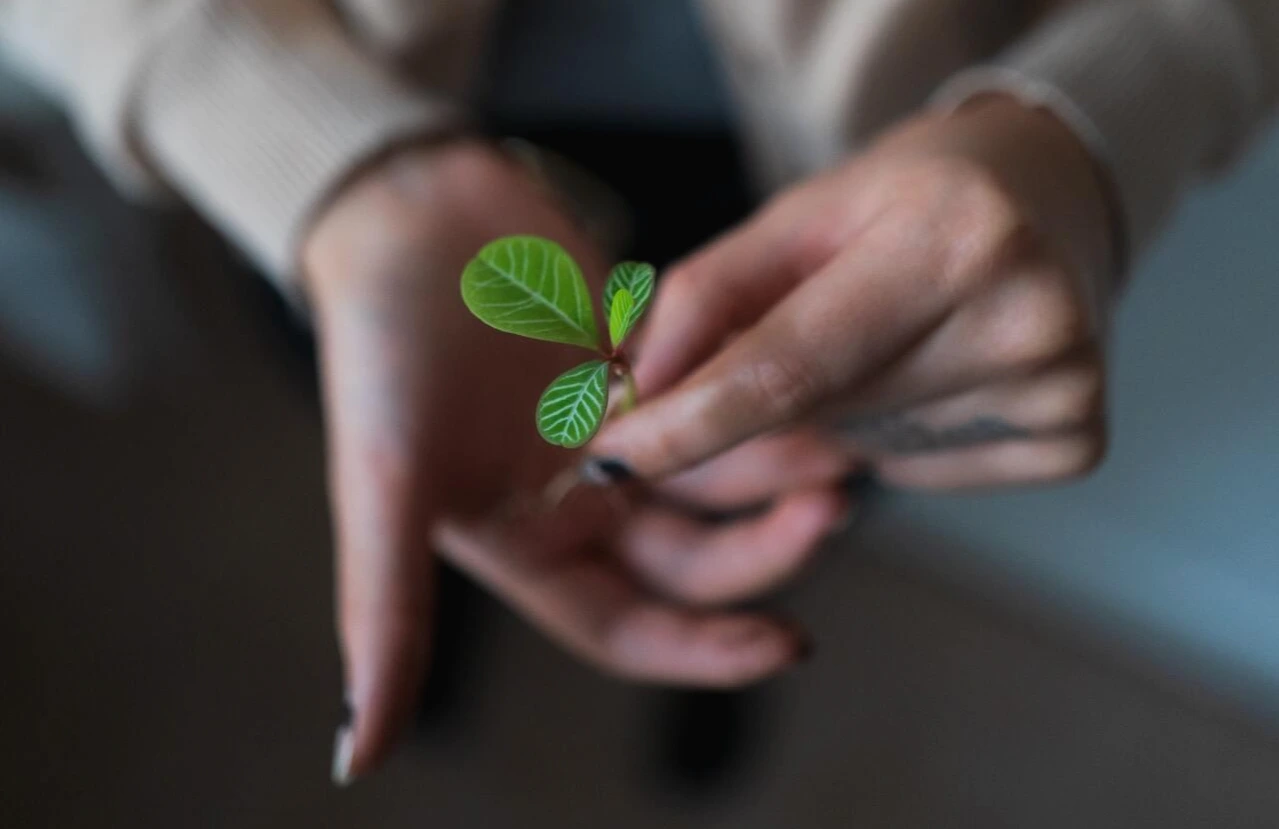 테이블 위에 화분을 두고 물끄러미 바라보다,