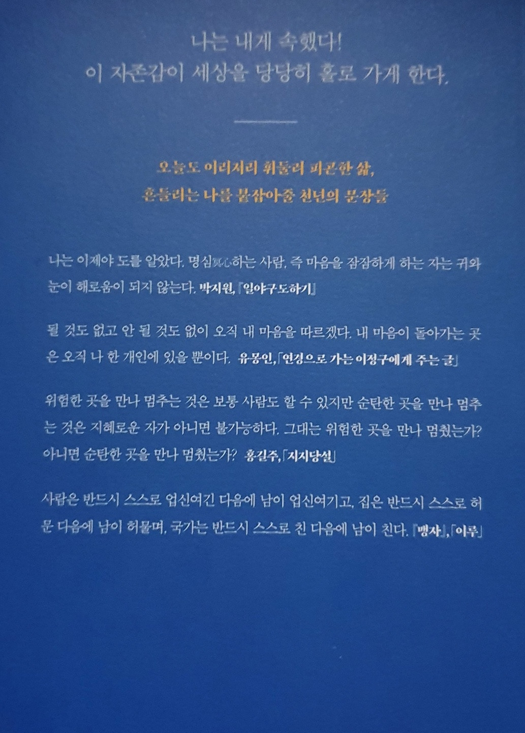 책에는 특히 박지원, 이덕무, 박제가를 많이 등장 시킨다. 이들외에 이규보, 유몽인, 홍대용, 정약용 등의 목소리도 담았다. 이들은 모두 분주한 세상 속에서 환경이나 사람들에 휘둘리지 않고 마음을 지키며 살아가기 위해 노력했던 사람들이다.
