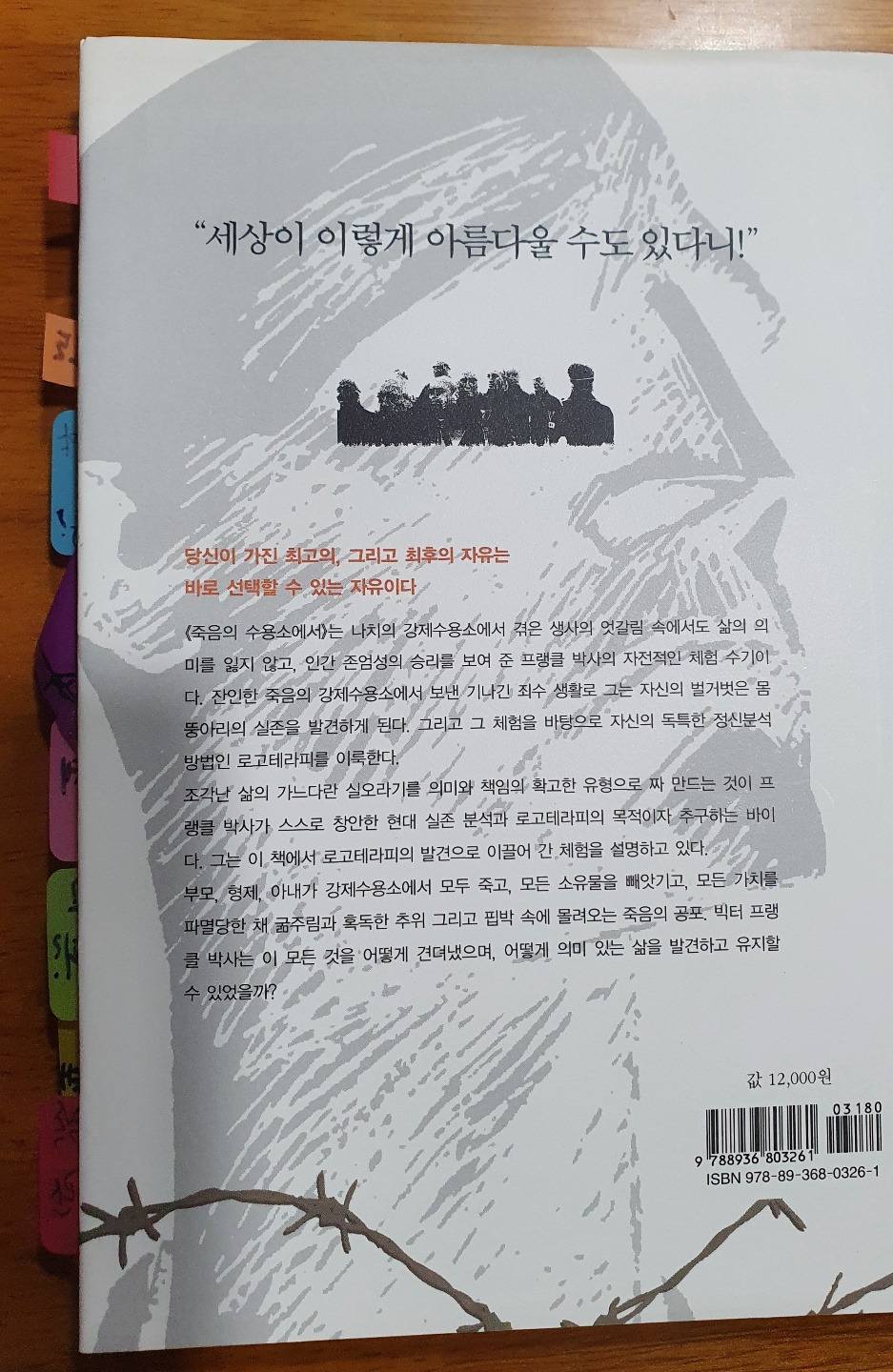 그래도, 불가피하게 정말 단 한권만 가져가야만 하는 상황이라면 눈물을 머금고 가슴에 품게 될 책은 '빅터 프랭클의 <죽음의 수용소>'이다.