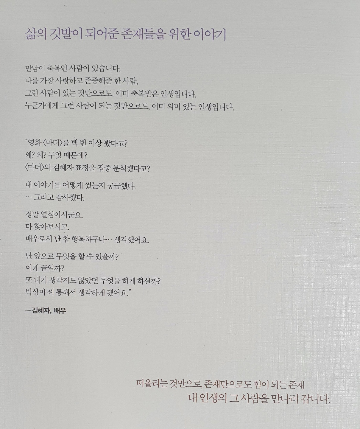 이 책의 첫 인터뷰 주인공은 김혜자 배우다. 한없는 사랑이 흘러 넘치는 사람. 그녀가 주고 받은 사랑이 잔잔한 나비효과를 일으켜 주변을 환히 밝혀준다.
