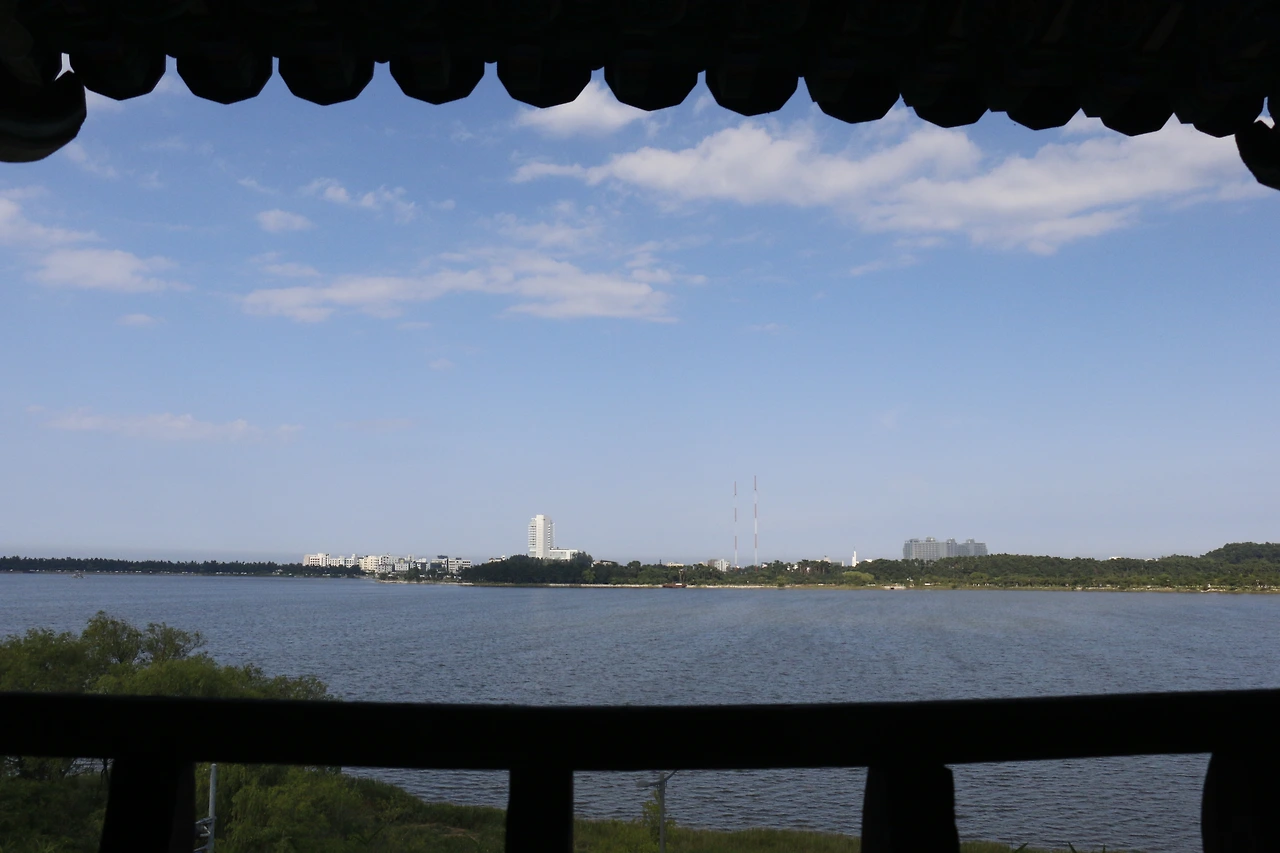 경포대 외곽을 둘러싼 팔작지붕은 부드러운 곡선으로 사방을 휘둘러 흐른다. 문득, 어느 한 방향에 이르러 경포호를 지긋이 바라본다. ‘거울같이 맑은 호수’라는 뜻을 가진 경포호. 누각의 안쪽 삼단 마루에 은근슬쩍 누워 보니 호수에서 불어오는 바람이 힘차다. 이 세상 그 무엇도 부럽지 않을 만큼의 호강을 누린다. 경포대 현판에는 ‘제일강산’(第一江山)이라는 문구가 있는데, ‘경치 좋은 곳으로 첫 번째 손꼽힐 만한 곳’임을 감탄하여 누군가 남긴 글이라 한다. 경포호는 예로부터 다섯 개의 달이 뜬다고도 하였다. ‘밝은 달이 뜨는 날이면 바다에도 달, 호수에도 달, 기울이는 술잔에도 달, 마주 보고 앉은 임의 눈동자에도 달이 뜬다’는 것이다. 눈 앞에 펼쳐지는 아름다운 호수는 바다와 소통하고, 푸른 하늘의 수평선과도 연이 닿는 중이다.