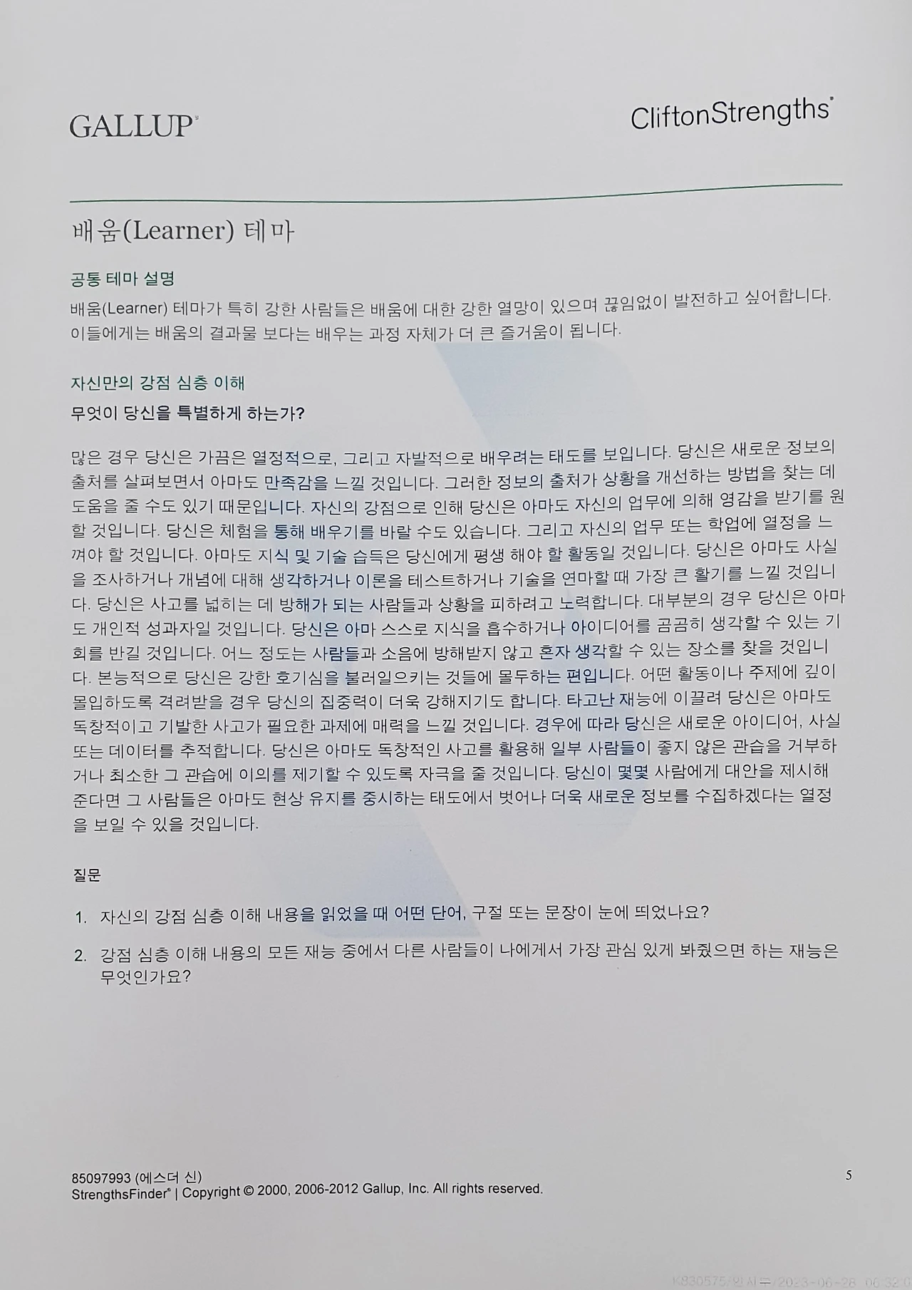 총34개의 강점 중에서 자신의 상위5개 테마를