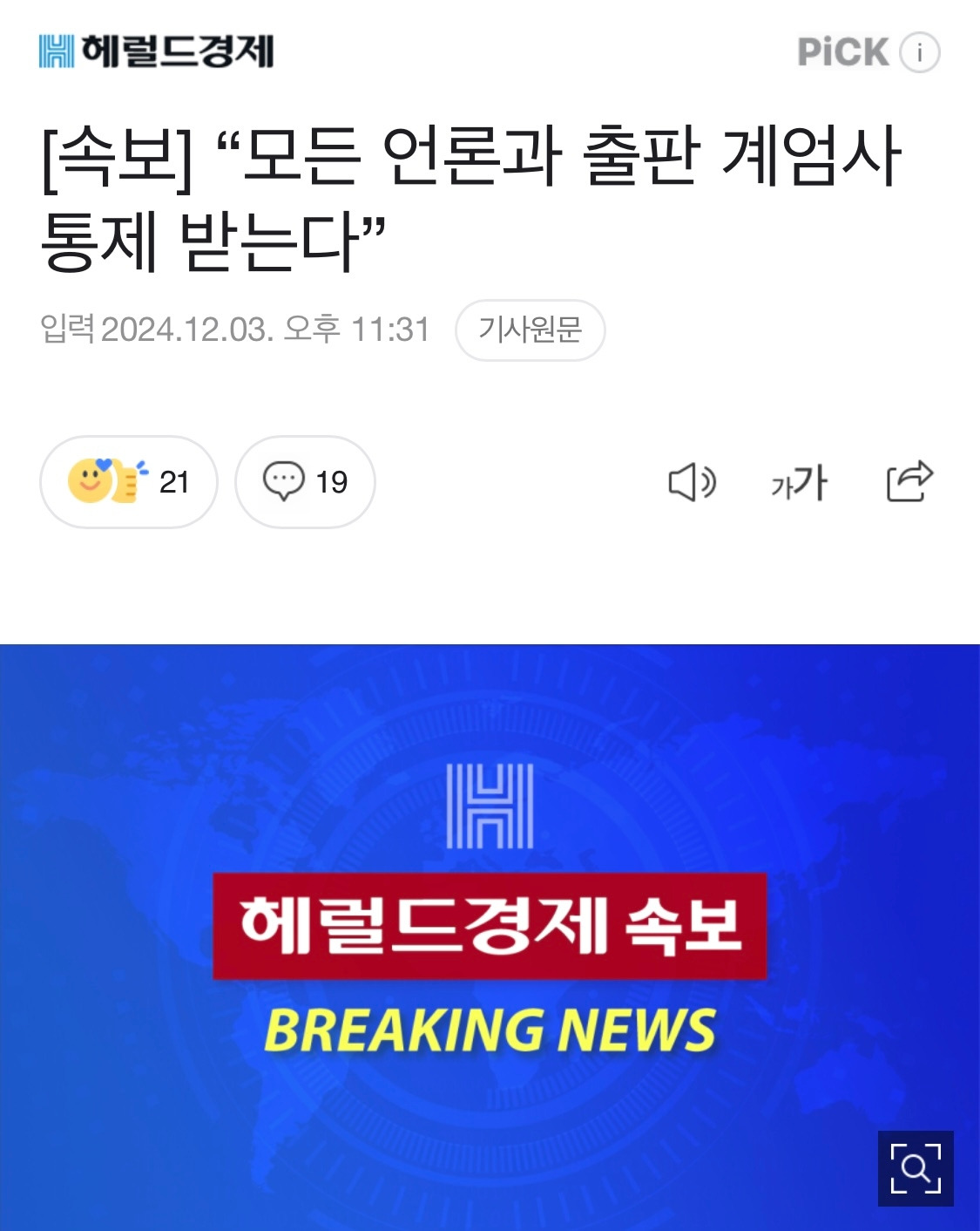 하지만 어젯밤 뉴스 중 나를 가장 겁먹게 한 것은 "모든 언론과 출판이 계엄사 통제를 받는다."는 내용이었다. 특히 출판이 계엄사 통제를 받는다는 부분이 가장 두려웠다. 말하고 싶어도 말할 수 없고 내가 말하고자 한 것이 나라의 검열을 받는다는 것은 인간의 자유를 통제한다는 점에서 가장 무서웠다. 출판 즉 문학도 예술의 한 장르다. 출판이 통제받는다는 것은 예술의 자유를 침해하는 것이다. 우리가 보고 싶은 것을 자유롭게 보고 즐거워하고 슬퍼하고 분노하고 그 감정과 감각을 기록하는 것. 그것이 예술이다. 그러나 어제. 계엄령이 해제되기 전까지.