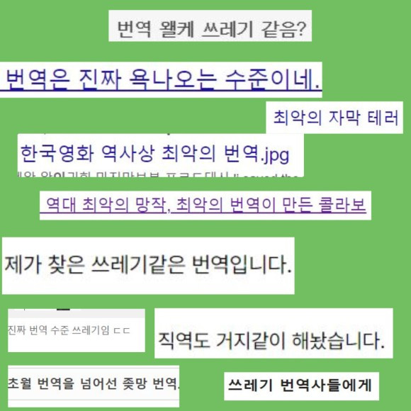 열악한 환경에서 번역하다 보니 실수가 나오지 않을 수 없는 시스템. 간혹 2주 정도 시간을 넉넉히 받는 경우도 있지만 그 2주를 한 드라마, 한 영화에만 할애한다면 번역가는 손가락 빨며 투잡 쓰리잡을 뛰어야 한다.