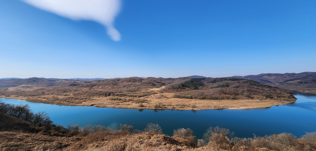 웅연을 내려다보며 옥녀봉으로 향해 가면, 문득 임진강과 군남댐이 한눈에 들어오는 널찍한 마루에 닿는다. 개안마루다. 여기에 서서 발밑을 보면 강줄기가 거대한 푸른 용의 몸짓으로 서쪽을 향해 휘돌아 움직인다. 오른편에 길게 누워있는 작은 섬이 유장한 강물의 흐름을 바꾼 것이다.