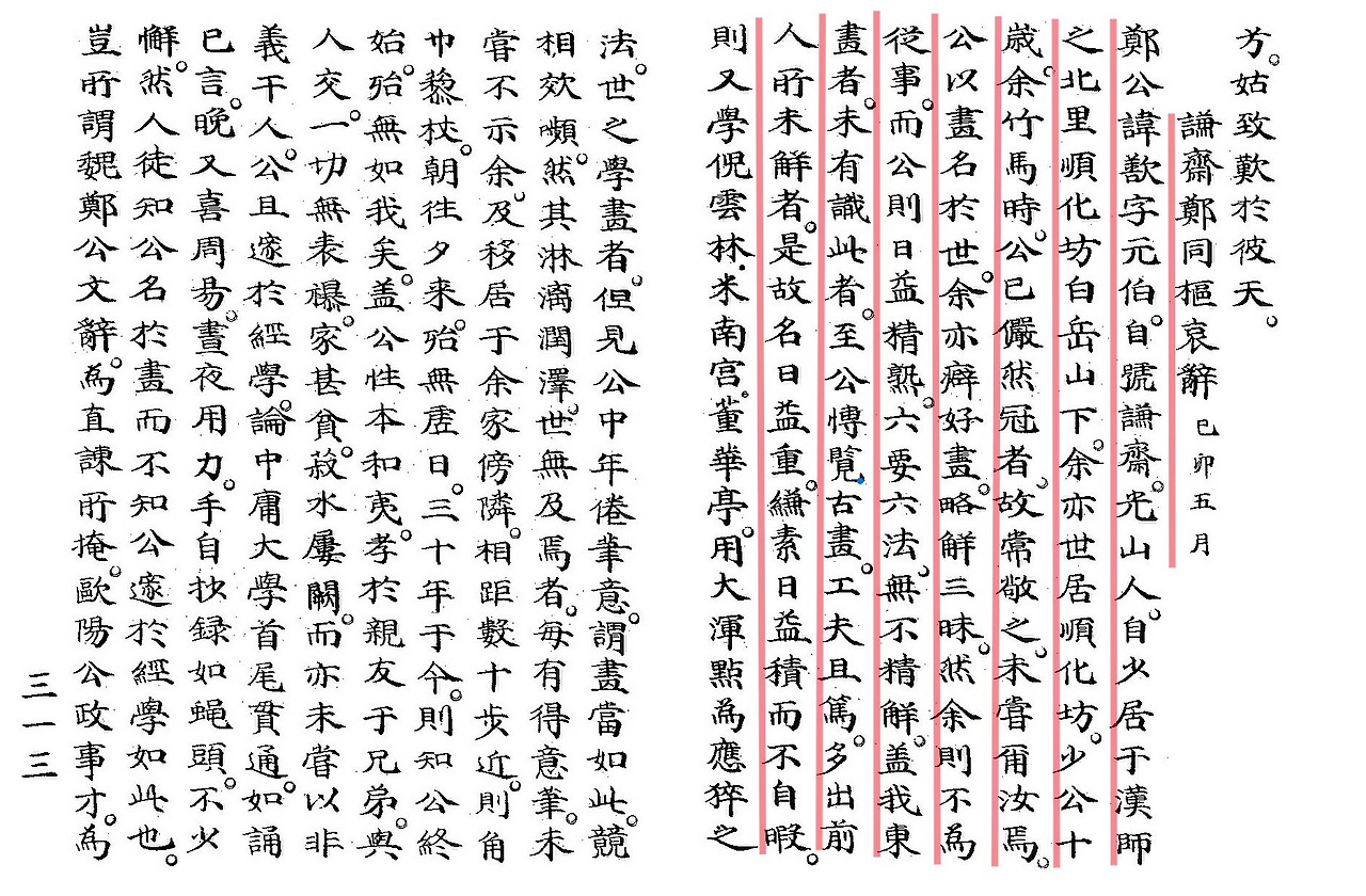 鄭公諱歚字元伯。自號謙齋。光山人。自少居于漢師之北里順化坊白岳山下。余亦世居順化坊。少公十歲。余竹馬時。公已儼然冠者。故常敬之。未甞爾汝焉。公以畫名於世。余亦癖好畫。略解三昧。然余則不爲從事。而公則日益精熟。六要六法。無不精解。盖我東畫者。未有識此者。至公博覽古畫。工夫且篤。多出前人所未解者。是故名日益重。縑素日益積而不自暇。則又學倪雲林,米南宮,董華亭。用大渾點爲應猝之法。世之學畫者。( 관아재고 고전번역원 DB )