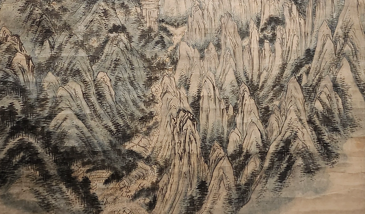 드론으로 촬영하듯 부감형식(俯瞰形式)의 원형 구도로 그렸는데 겹겹이 쌓인 산의 주름질 표현으로 골짜기에서 자연의 깊이감과 깊숙한 공간감을 갖고 있어요. 그러면서 우뚝 솟은 바위나 산의 형상을 아래에서 위로 올려다본 것처럼 세로선을 많이 써서 웅대한 느낌을 주고요. 가까운 산에서 먼 산을 바라보는 것처럼 광활하면서 넓고 아득한 느낌도 있지요. 참으로 알게 모르게 다양한 시점을 적용한 그림이에요.