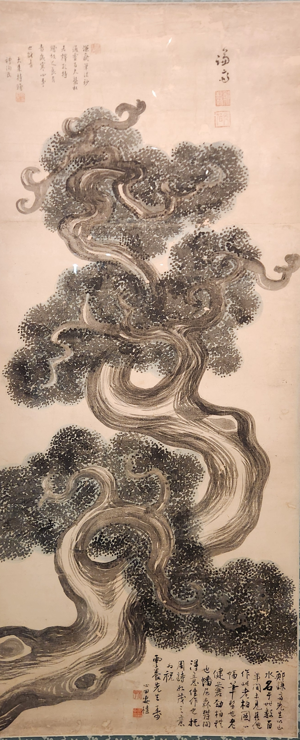 굵은 붓질로 나무의 질감을 부드럽게 드러내면서 시퍼런 잎사귀를 짙은 농묵으로 풍성하게 나타냈다. 입체감을 살리면서 중첩된 붓질로 주름잡은 나무껍질의 질감이 촘촘하다. 먼저 구불거리는 줄기와 가지를 따라 잎은 엷은 물감으로 칠하고 그 위에 잎 하나하나 점을 가득 찍어 묘사하였다. 둥글게 원을 그리면서 가지를 뻗은 잎이 왕성하면서 생동감이 넘친다.