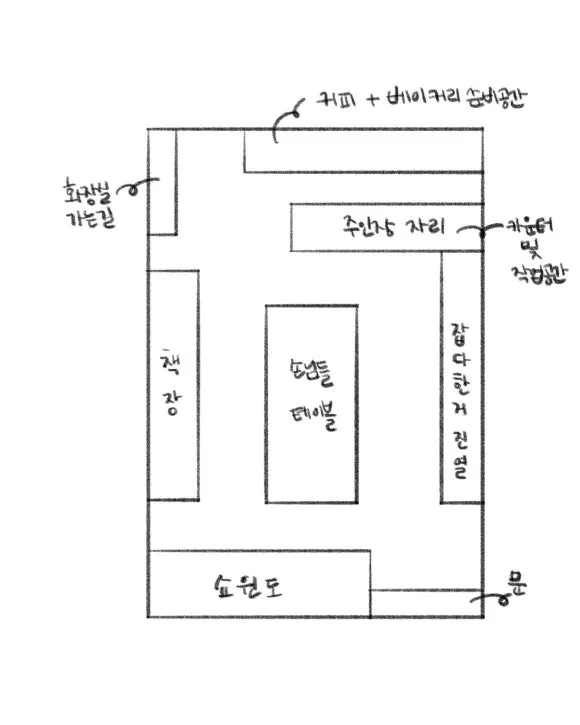 사실, 내부는 한 종류의 책이 채워진 책장 하나와 여러사람이 함께 앉아 책을 읽을 수 있는 테이블 하나. 그게 다였다.