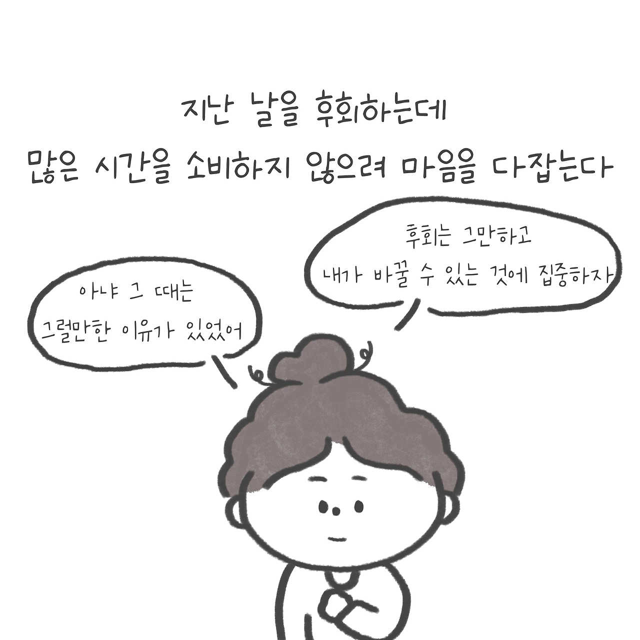 일이 잘 풀리지 않거나 현재의 나의 모습이 마음에 들지 않을 때면 많은 노력 없이도 손쉽게 꺼내 볼 수 있는 후회를 꺼내 들고 이랬다면 더 나았겠지, 저랬다면 지금 안 이러겠지 등 현재 나의 상태를 부정하고 후회한다.