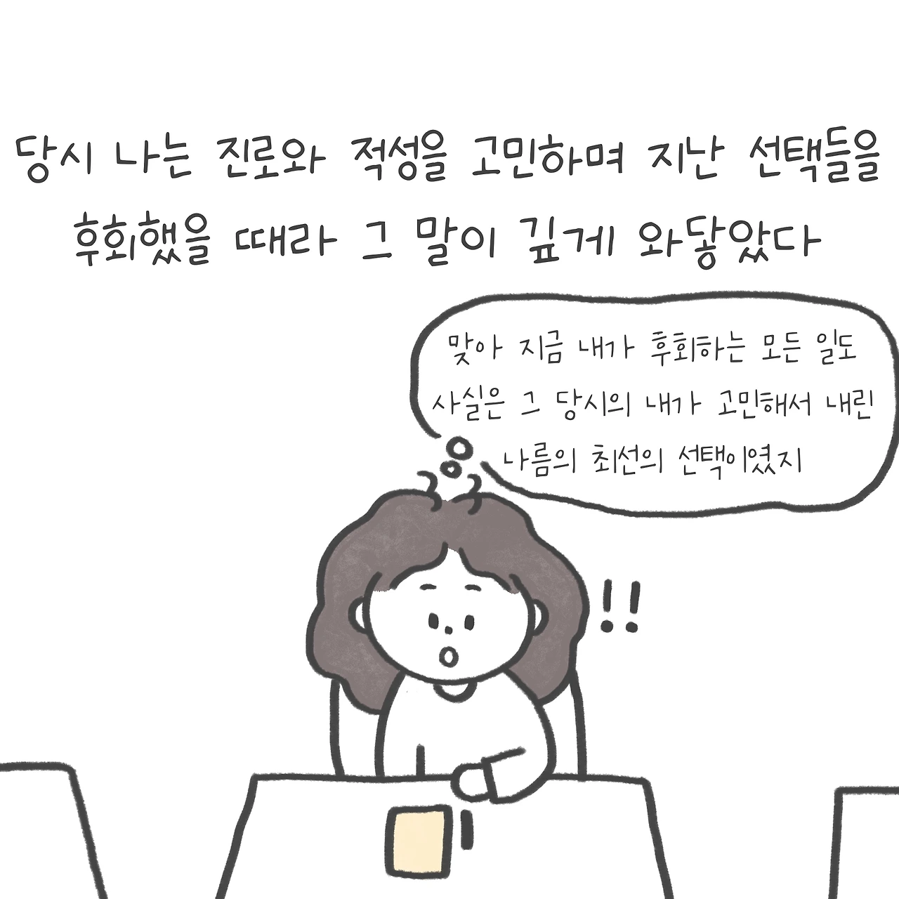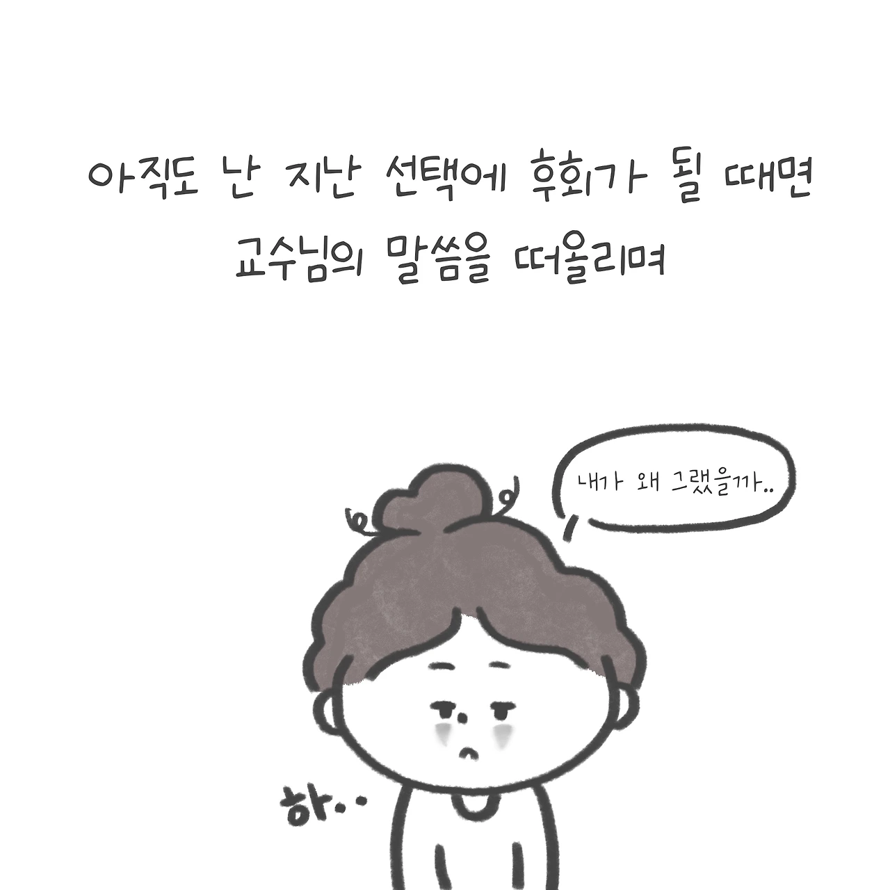 아직도 나는 교수님의 말씀을 떠올리며, 내가 한 선택에 의해 자괴감과 후회가 들 때면 별 노력 없이 자신을 자책하기만 하면 끝나는 후회보다는 내가 앞으로 바꿀 수 있는 것에 집중하는 시간을 가지며 살려고 노력한다.
