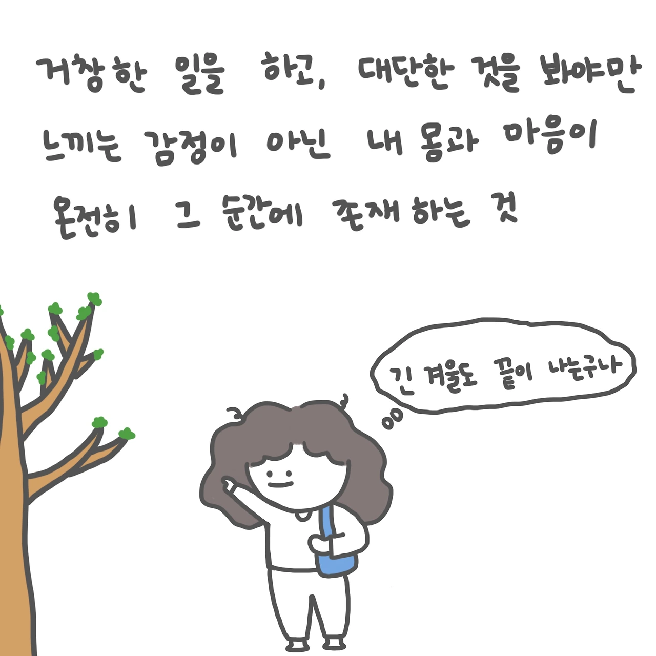 기나긴 겨울이 끝나고, 휑해진 나뭇가지에 새로 돋아 나는 푸릇한 잎 하나 보며 멈춰서 웃음 짓는 것