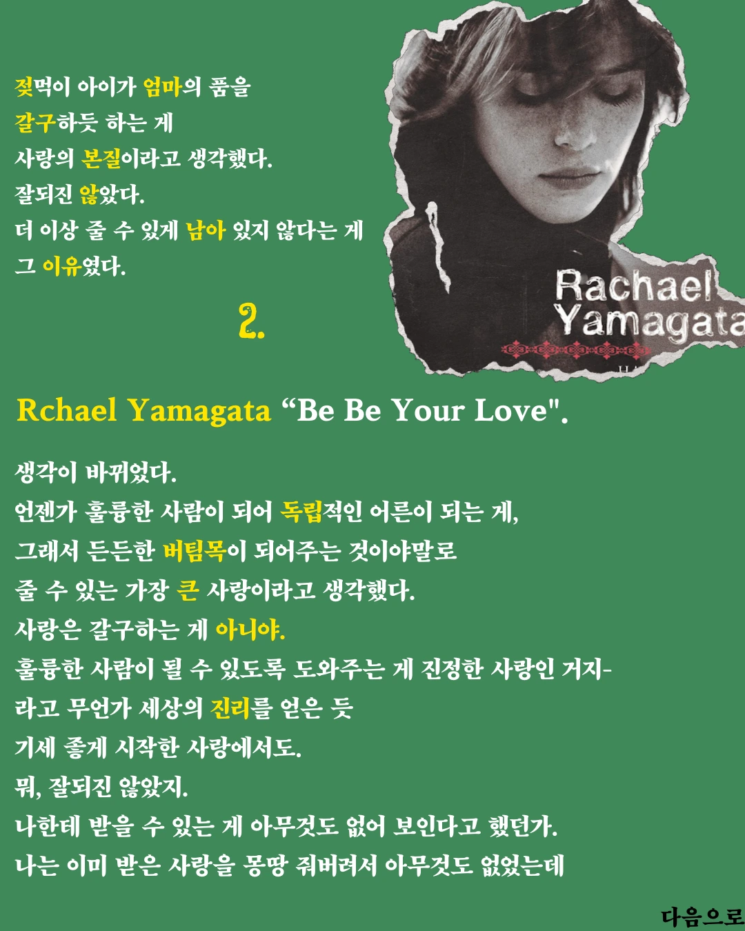 사랑이 아닌 단어로도 표현할 수 있는, 곱씹어 봤을 때야 아 그거, 사랑이었네 하는 한 두 번쯤 씹힌 사랑을-