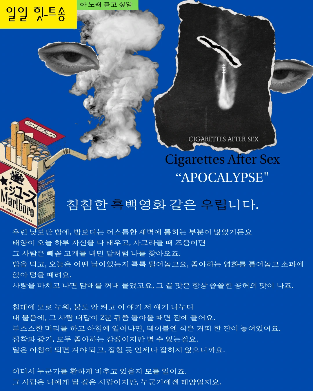 사랑을 마치고 나면 담배를 꺼내 물었고요, 그 끝 맛은 항상 씁쓸한 공허의 맛이 나죠.