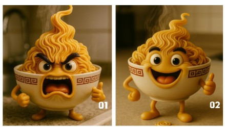 a) "주방에 화가난 라면의 모습을 사진스타일로 그려줘"
