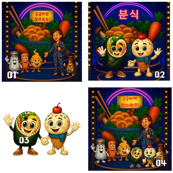 0 위 그림은 어느 부분을 합성하였을까요? ......................(라면과 참기름 + 김밥)