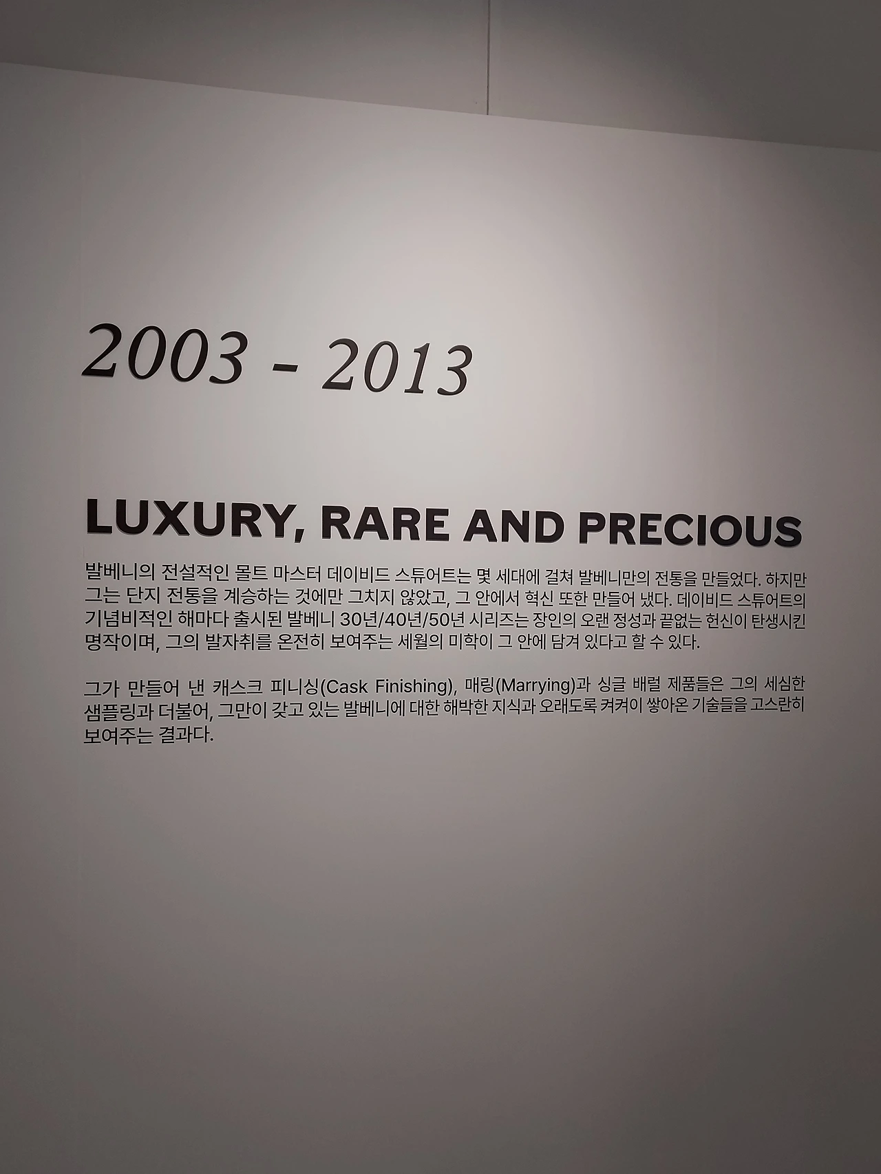 아쉽게도 기획력이 좋거나 스토리텔링에 충실한 전시는 아니었다. 스튜어트가 발베니에서 보낸 60년을 보여주는 다양한 기록이라던가, 그의 장인 정신이 녹아든 소품이나, 발베니를 향한 애정이나 자부심이 담긴 인터뷰 영상 같은 것은 찾아볼 수 없었다. 그저 특별한 위스키를 진열해 둔 데 불과했다.