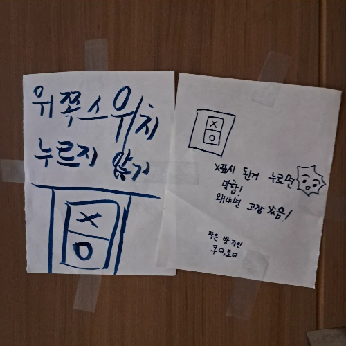아이들에게 위쪽 스위치가 고장 났으니 새로 교체할 때까지 누르지 말라고 얘기해 두었다. 조금 이따 아이들 방문에는 종이가 두 장 붙었다. 언니가 그린 그림을 보니 엄마 말을 잘 이해했다. 조금 뒤 작은 방 주인 쿠디와 토디는 기분을 풀고 다시 인형 놀이에 집중했다. (꿍이는 자기를 쿠디, 울이는 토디라고 불러달라고 할 때가 있다. 오늘이 그날인가 보다.) 내일은 새 스위치를 사러 가봐야겠다.