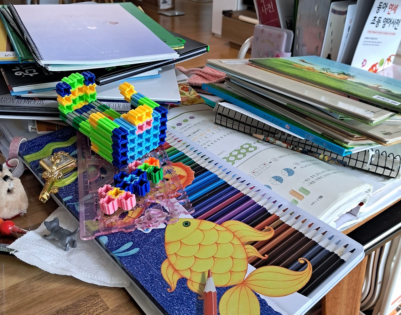 책상은 치우기가 무섭게 도로 쌓인다. 색연필을 꺼내고 블록이 나오고 문제집이 쌓인다. 책상 위에서 뭔가를 할 수 없을 정도가 되면, 자기 자리를 두고 스륵 엄마 자리에 천연덕스레 앉는다. 엄마 자리에도 물건이 하나씩.