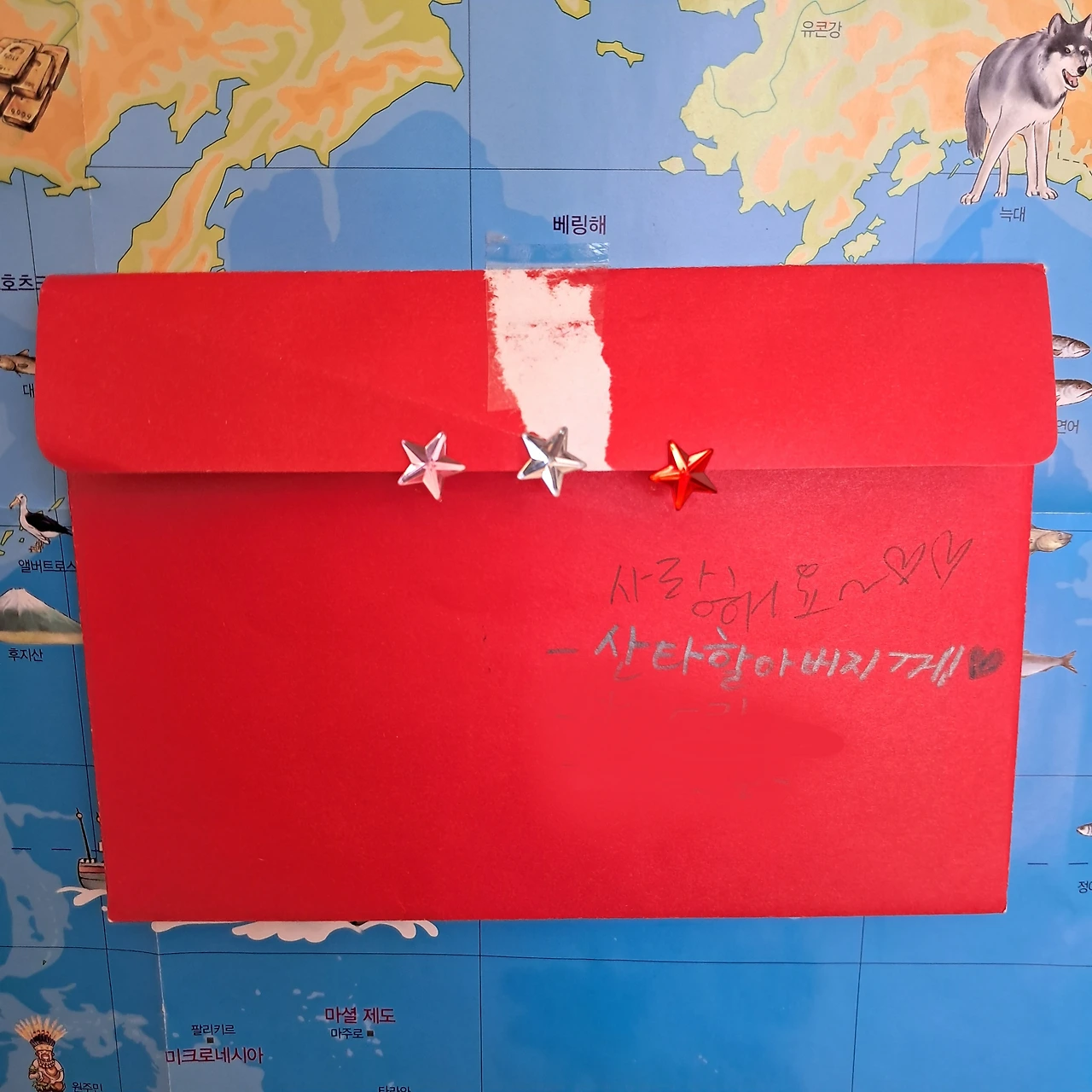우리 집 거실 한편에는 산타할아버지께 드리는 편지가 붙여져 있다. 선물을 미리 정해두면 산타할아버지가 편하실 거라고 했더니, 빨간 봉투를 잘 보이게 붙여놓았다. 엄마는 겨울이 되자 수시로 편지를 열어본다. 선물 이름이 적혀 있던 자리는 썼다가 지운 흔적이 여러 번이다. 여름을 지나고 겨울이 오는 사이 선물의 종류는 여러 번 바뀌었지만, 선물을 기다리는 그 마음은 반짝반짝 계속 빛이 난다.