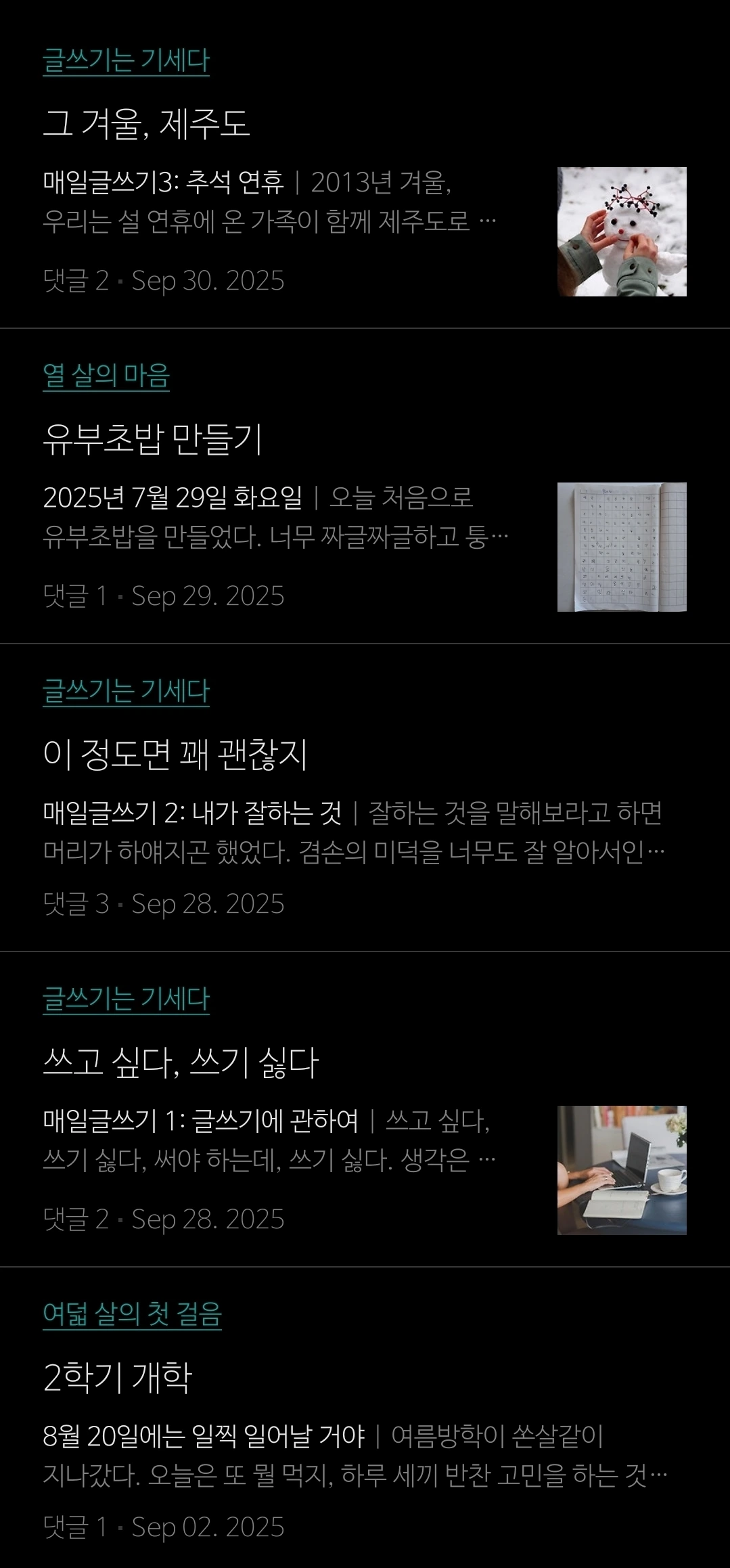 '매일 글쓰기' 매거진에 참여했다. 한동안 글쓰기를 쉬고 있어 마음이 불편하던 차였다. 시간이 부족하고 제대로 할 수 없을 거라는 걱정이 앞섰지만 마음이 끌리는 대로 움직였다. 28일부터 하루 한 편씩 글이 쌓여가고 있다. 역시 해보길 잘했다.