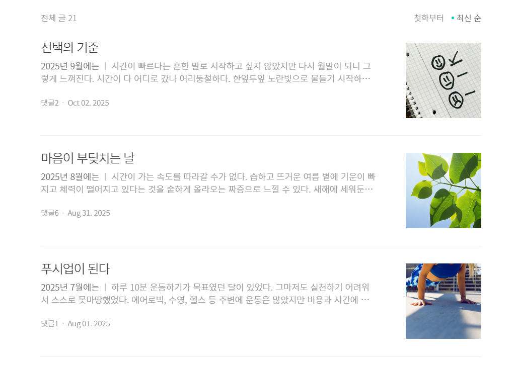 브런치에 '월간 여름' 매거진을 발행하고 있다. 한 달에 한 번씩 쓰던 것이 벌써 21개가 모였다. 처음에는 한 달을 돌아보고 잘한 것과 아쉬운 점을 기록했지만 지금은 목표와 실천한 것, 다음 달의 계획, 인상 깊은 순간과 사진을 함께 담아 더 풍성해졌다.