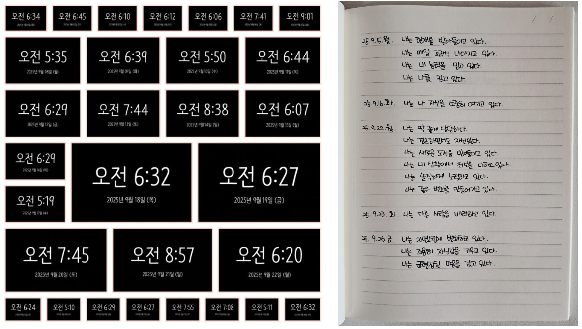 아침에 일어나면 게슴츠레 겨우 뜬 눈으로 휴대폰을 먼저 찾는다. 경쾌하고 다소 시끄러운 소리를 내며 나를 깨워주는 휴대폰의 알람을 끄고는 자연스레 타임스탬프 앱을 켠다. 찰칵. 오늘의 일어난 시간을 기록했다. 필사도 마찬가지다. 정해진 시간은 없지만 하루 한 줄, 때로는 미뤄둔 여러 문장을 한꺼번에 따라 써 본다.