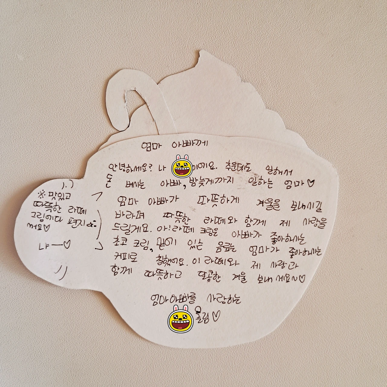 엄마 아빠가 따뜻하게 겨울을 보내시길 바라며 따뜻한 라떼와 함께 제 사랑을 드릴게요.