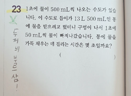 어제도 그랬다. 148쪽 23번 문제가 말썽이었다. 1초에 500mL씩 나오는 수도가 있는데 13L 500mL인 통에 물을 받으려고 했더니 구멍이 나서 1초에 50mL씩 물이 빠져나간다면 통에 물을 가득 채우는데 걸리는 시간이 얼마인지 구하는 문제였다.