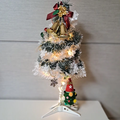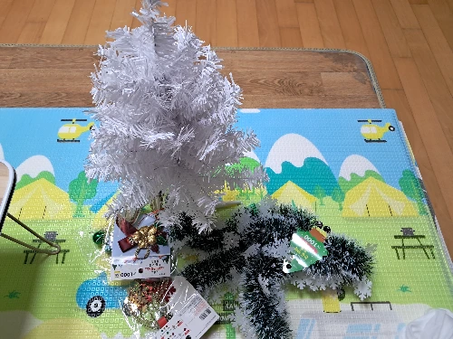 너무 크지도 않고 적당한 크기의, 어른 팔 길이만 한 트리를 골랐다. 마치 초록 나뭇잎에 눈이 온 것 같은 느낌의 긴 장식물과 빨간색, 초록색, 금색의 매끄럽고 반짝이는 구슬을 골랐다. 아이 손바닥만 한 종 두 개가 달린 붉은 리본도 샀다.