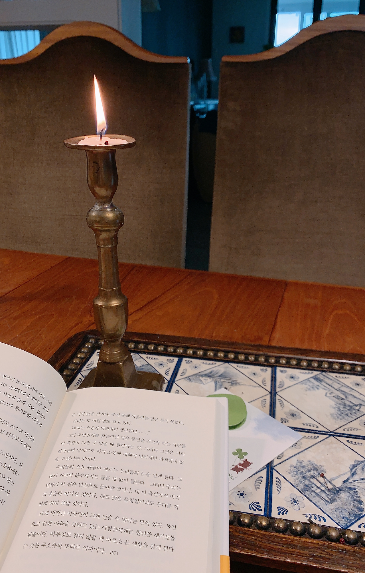 서재에서 놀던 아이가 무언가를 들고 종종종 뛰어온다. 법정 스님의 책 <무소유>, 한 손에는 조그마한 종이 조각도 보인다.