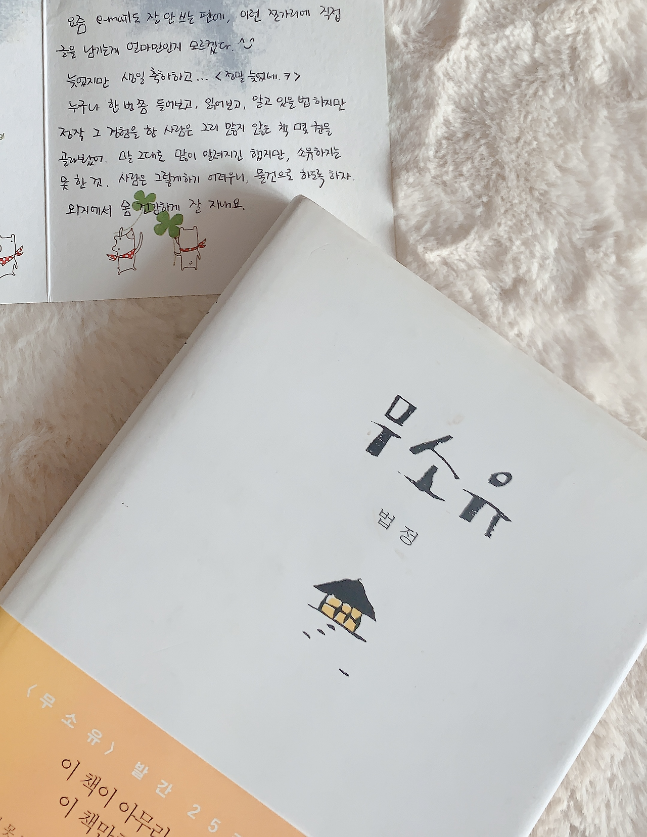 하얀 책 귀퉁이들이 노릿노릿 변해갈 만큼의 시간이 흘렀지만, 여전히 나에게 풋풋함으로 남아있는 사람. 아, 내가 이런 선물을 받았었구나. 10년도 훌쩍 넘어서야, 이제서야 나에게 전달된 것 같은 이 마음, 짧은 글을 괜히 두 번 세 번 다시 읽어본다. 나를 위해 서점에 들러 이 책 저 책을 뒤적이며 한 권 한 권 집어 들었을 그 사람의 모습이, 조그마한 카드를 골라 놓고 깨알만 한 글씨로 담기 시작한 다정한 마음이 배어 나온다.