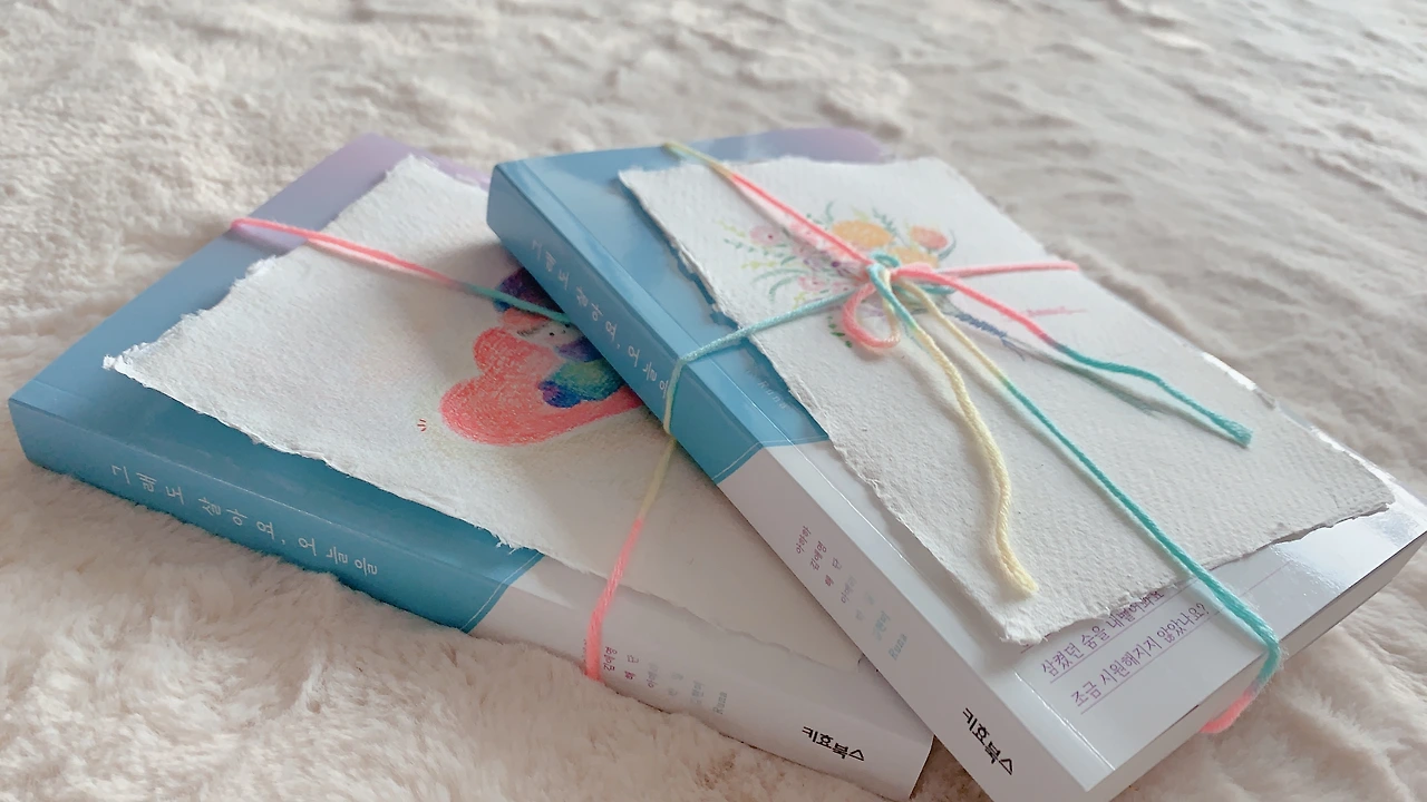 책이 나왔다. 출간 전 계약 조건에 따라 1쇄 이후에는 주문 후 인쇄 방식으로 제작되기에 출간 후 내 손에 들려진 건 한 권뿐. 인쇄소에서 책이 도착했다는 에디터의 연락을 받고 콩닥콩닥 뛰는 가슴으로 달려가 처음으로 내 이름이 새겨진 책을 안았다. 예뻤다. 마음을 담아 열 권을 구매했다. 맨 앞 장을 펼쳐 나다운 조그만 글씨를 한 자 한 자 꾹꾹 눌러 편지를 적었다. 직접 그린 그림엽서 한 장을 앞에 덧붙이고 포근포근 색동 털실로 리본을 묶어 나의 이야기를 들려주고 싶은 사람들에게 전했다.