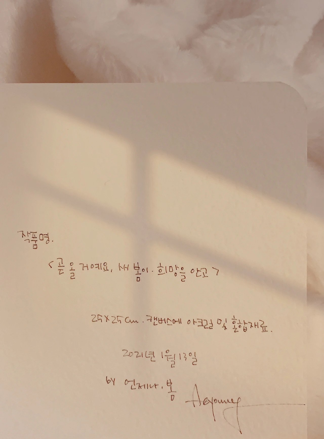 <요즘 집안 분위기가 어둡다는 말씀에 마음이 쿵 내려앉았습니다. 저의 작품이 어두운 분위기를 조금이라도 밝혀드릴 수 있다면, 000님의 마음에 잔잔한 위로와 기쁨을 더해드릴 수 있다면 참 좋겠습니다.