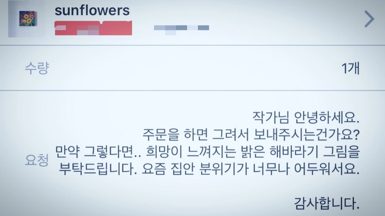 <작가님, 안녕하세요. 주문을 하면 그려서 보내주시는 건가요? 만약 그렇다면... 희망이 느껴지는 밝은 해바라기 그림을 부탁드립니다. 요즘 집안 분위기가 너무나 어두워서요. 감사합니다.>