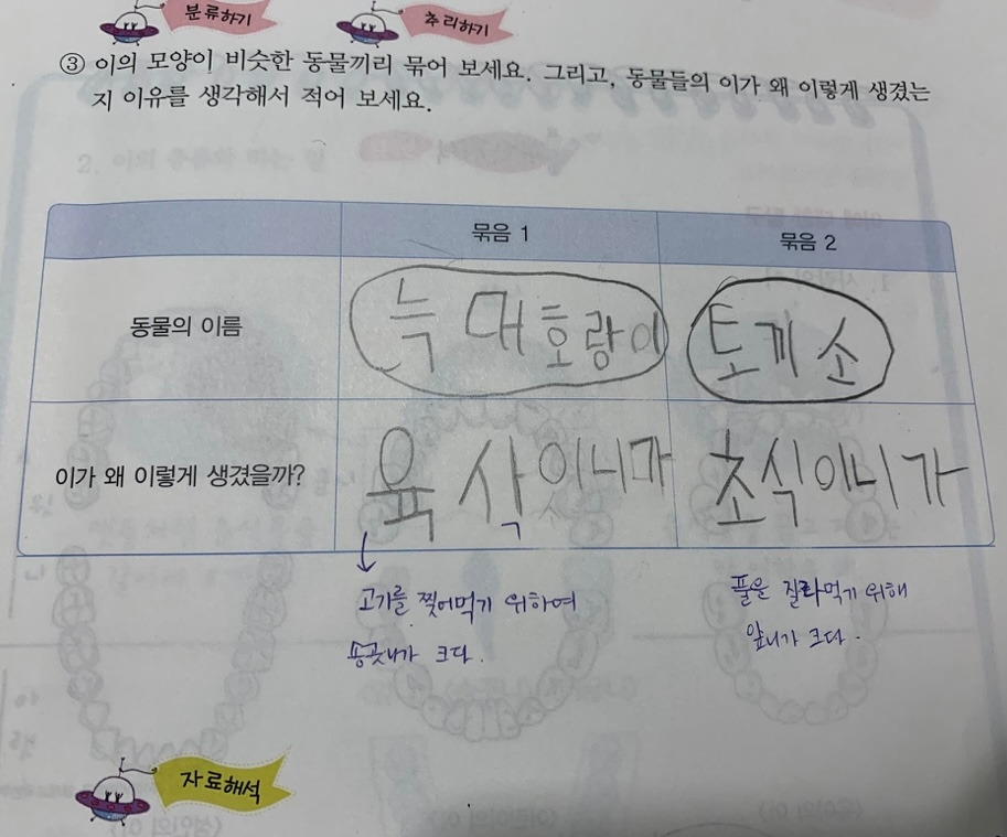 문제 2) 동물들의 이가 왜 이렇게 생겼는지 이유를 생각해보세요.