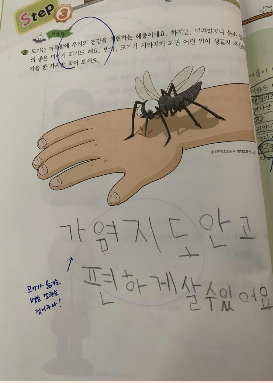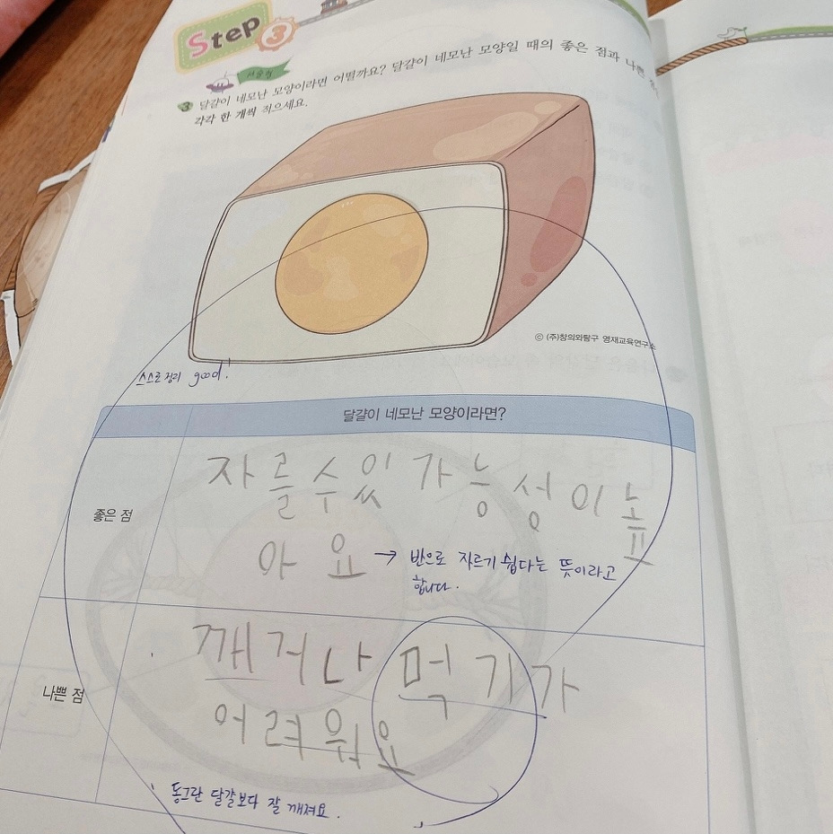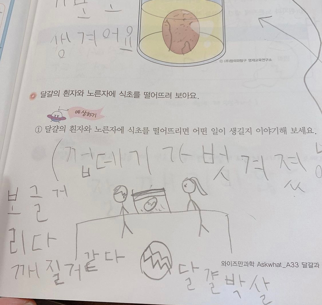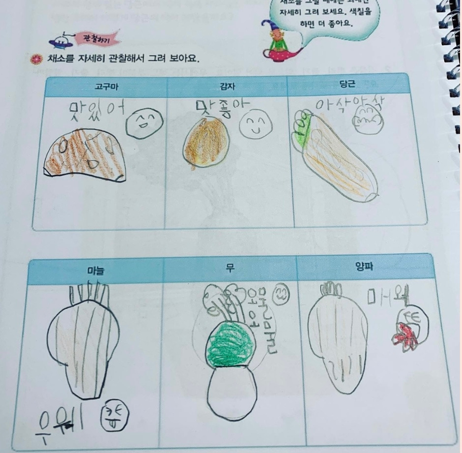 아주 틀린 답은 아니지만 정답표에 제시된 모범 답안도 아닌, 어딘가 엉뚱하고 귀여운 대답들로 가득한 교재를 한 장 한 장 넘겨보며 아이와 함께 한참을 웃었다. 아직까지 문장으로 표현하기 어려운 것들은 훨씬 더 직관적이고도 재치 있는 그림들을 그려 넣기도 하고, 아이만의 방식으로 과학적인 상상력과 사고력을 키워 나가고 있는 모습들이 고스란히 묻어났다. 1학년 아이들에게 중요한 건 이론이나 지식보다는 과학 자체에 흥미를 가지고 ‘왜?’를 떠올리게 하는 것이라는 선생님의 지론은 나의 교육 철학과도 맞닿아 있었다. 다행이다. 어쩐지 정답을 강요할 것만 같은 교육의 길목에서 같은 마음을 품은 선생님을 만난 것이.