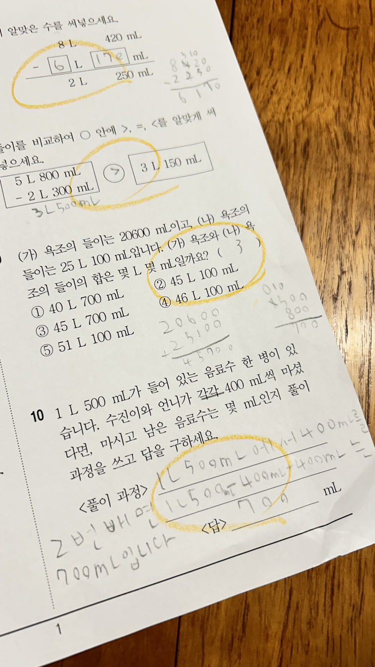 식탁 위에 가지런히 놓인 평가지 한 장. 수학 '들이와 무게' 단원이다. 밀리리터와 리터, 그램과 킬로그램 뭐 이런 개념들을 배우는 단원인데, 찬찬히 하나하나 아이가 풀어간 시험지를 살펴보다 문득 울컥, 눈물이 차오른다. 주책맞게. 재빨리 눈을 깜빡여 눈물을 꿀꺽 삼켜본다. 말도 못 하고 '어어, 마, 음마, 엄마' 이러던 아기가 언제 이렇게 커서 측정값을 어림하고, 단위가 다른 수치를 더하고 빼고, 문장 속에 살짝 숨은 함정까지 밑줄 딱 쳐가며 풀어낼 수 있는 '학생'이 되어버린 건지. 여전히 학교에서 돌아오면 엄마 품으로 쏙 달려와 대롱대롱 매달려 안기고 얼굴을 부비고 푹신한 소파 위에서 한참을 끌어안은 채 뽀뽀를 쏟아붓는 그 아기와, 이 시험지를 빼곡히 채워나간 학생의 간극이 새삼스럽다.