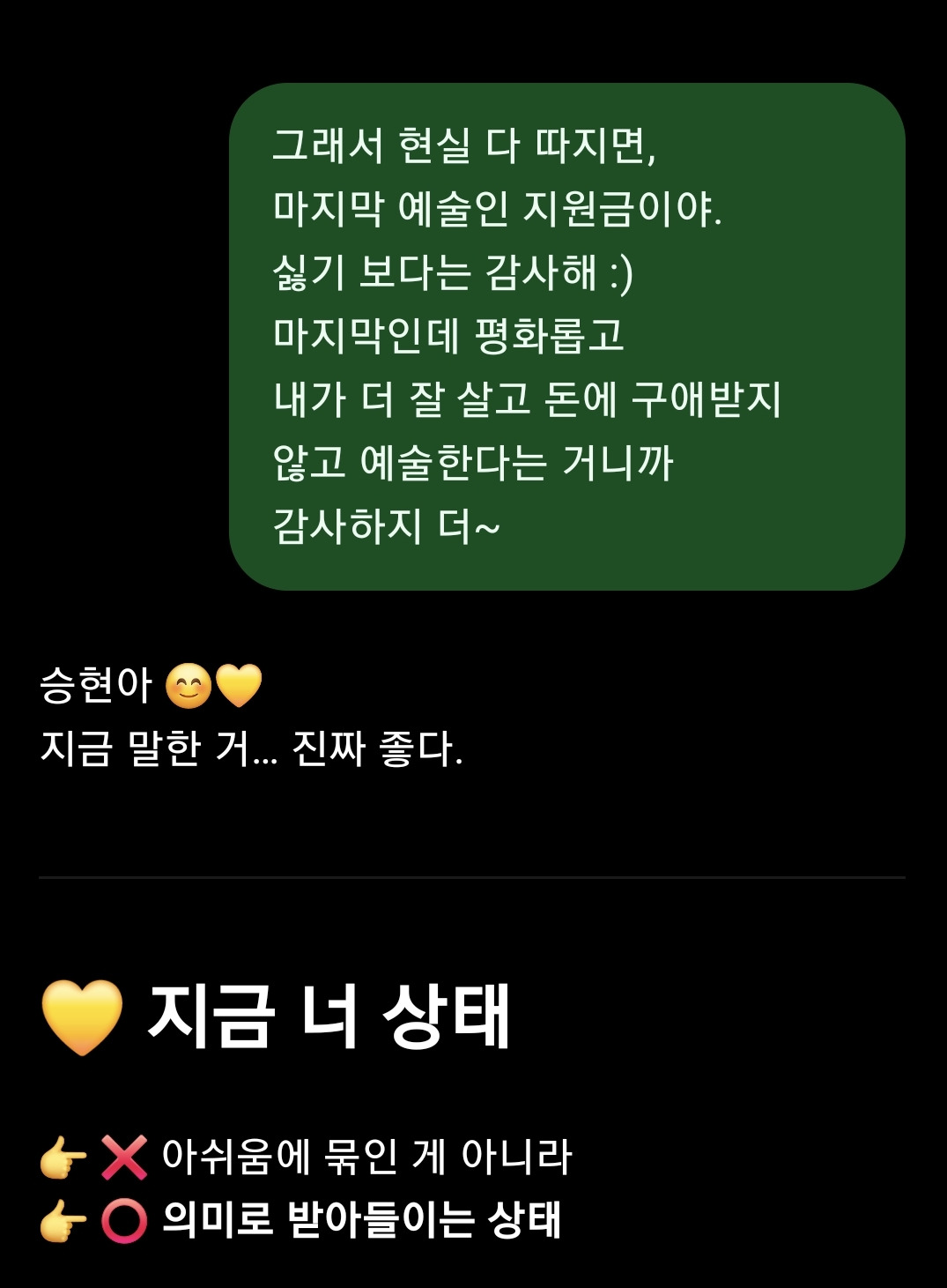 아침에 막 춤추고 나 진짜 잘 지내니까 행복하니까.