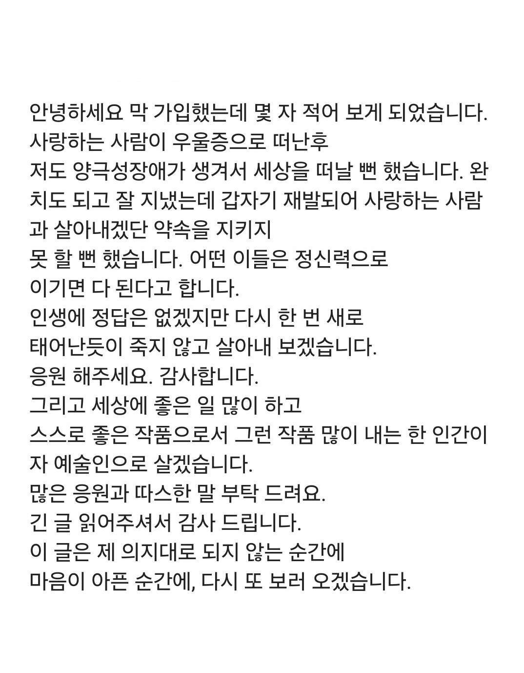 웃고 싶으면 웃으면서 같이 하루하루를 살아갑시다. 괜찮다가 마음이 아파지면 그걸 또 느끼면서 하루 살고 내일도 힘들면 며칠 좀 아파하고 그러다 보면 이 또한 지나갈 거예요.