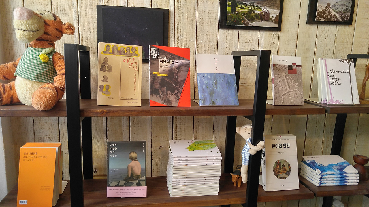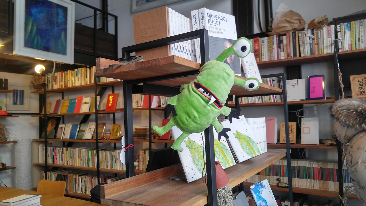 서점 메인에 자리잡고 있는 책장. 이처럼 귀여운(?) 인형이 곳곳에 매달려있다. 인형들을 보는 재미도 쏠쏠하다. 서점은 김태형시인의 신간을 비롯한 몇권들의 새 책들과 헌 시집들로 채워져 있다. 헌 시집들은 딱 봐도 오래되고 귀해 보이는 것들, 초판 시집같은 것들과 내가 알던 시집 등이 있었다. 이 시집들을 모으기 위해서 시인은 여기저기 헌 책방들을 많이 돌아다니지 않았을까.